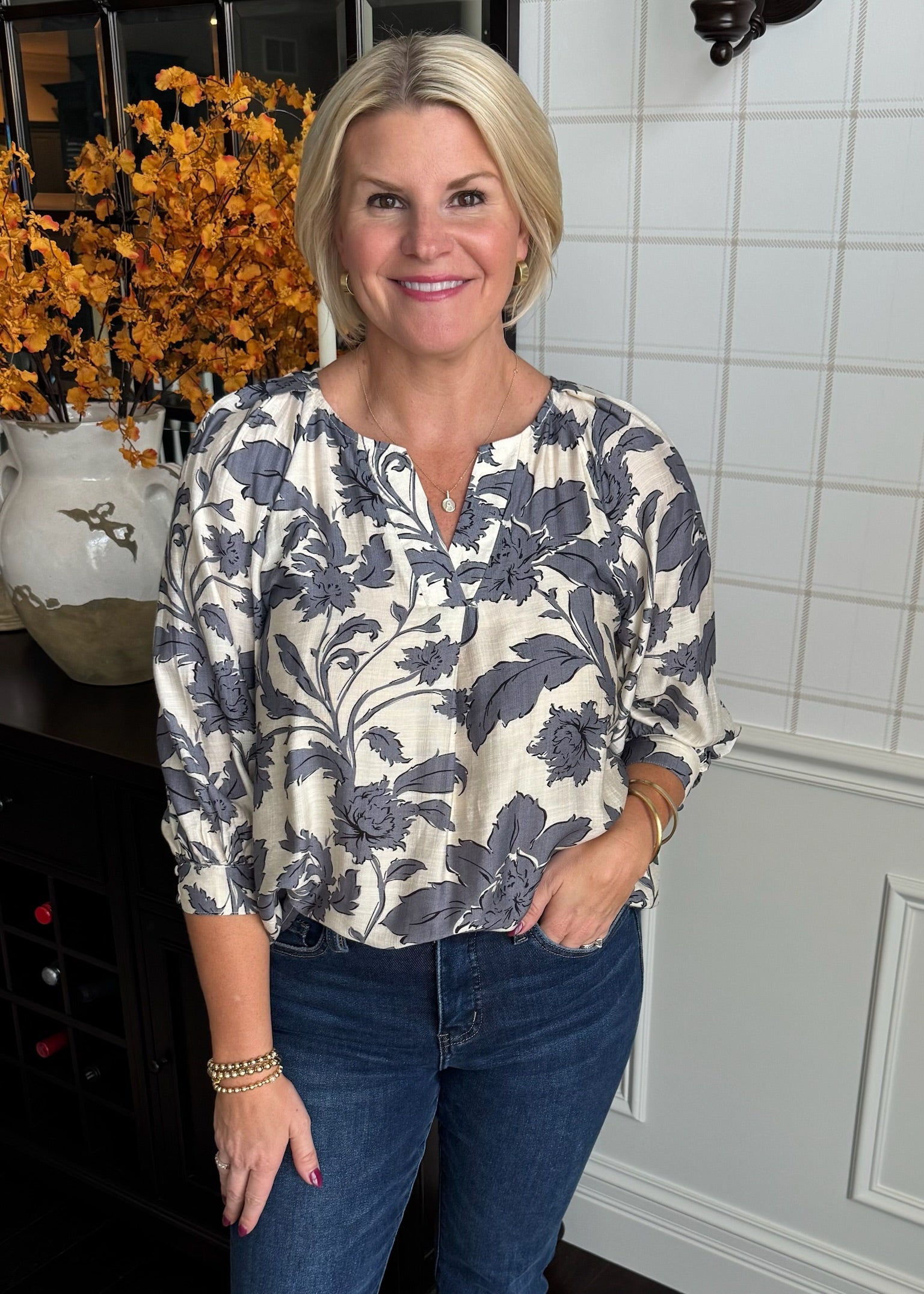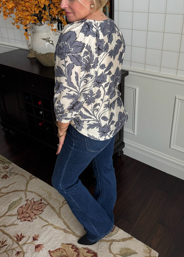Denim Blue Floral Print Top - Small is backordered. It will be shipped when back in stock.