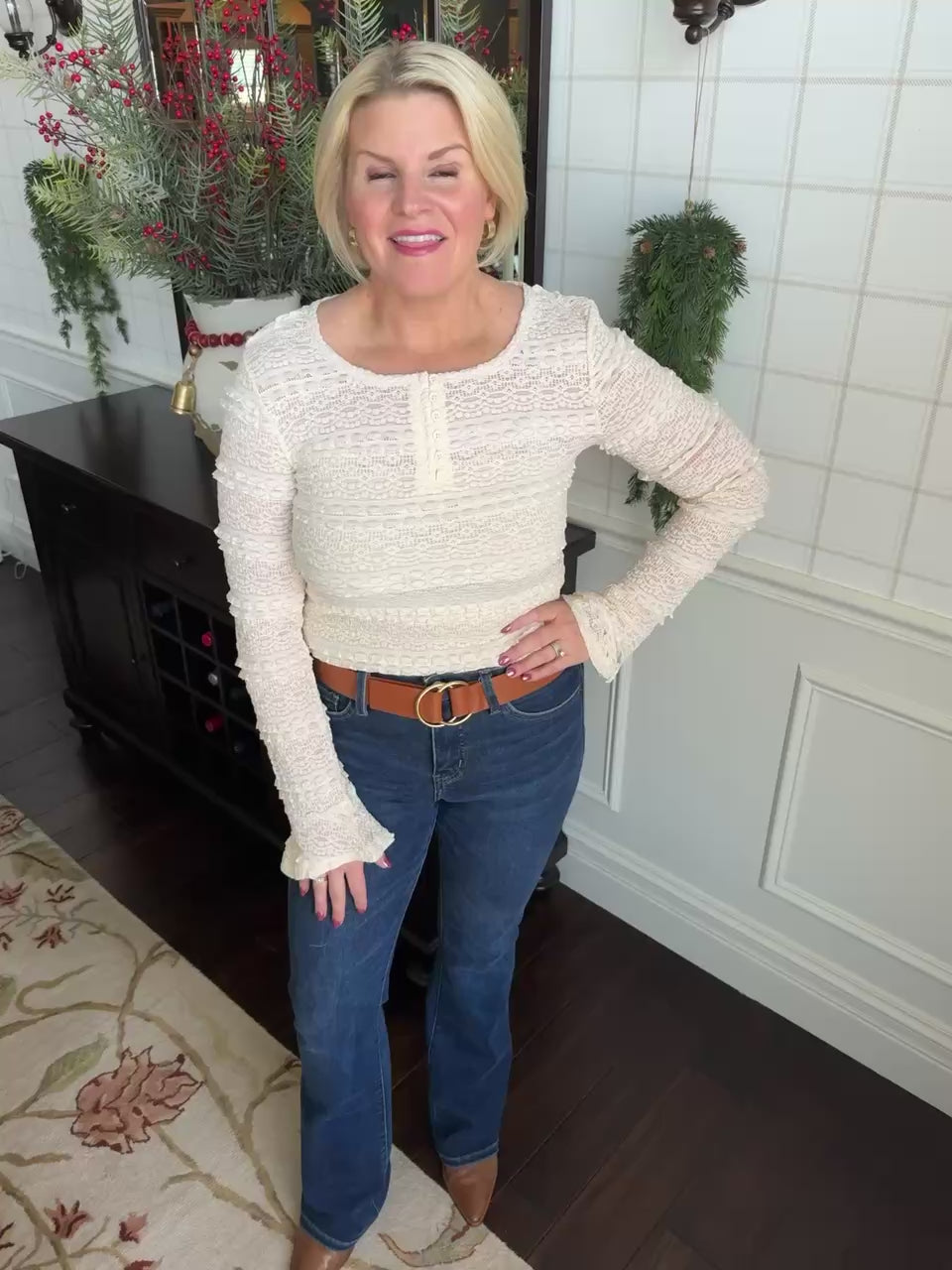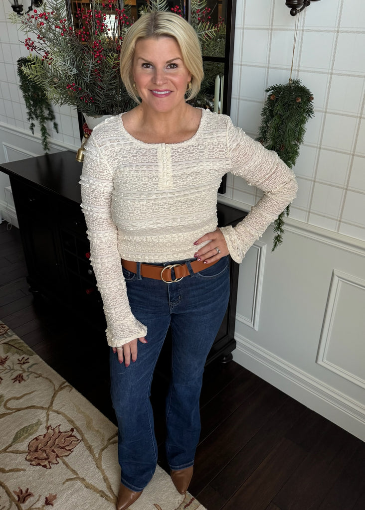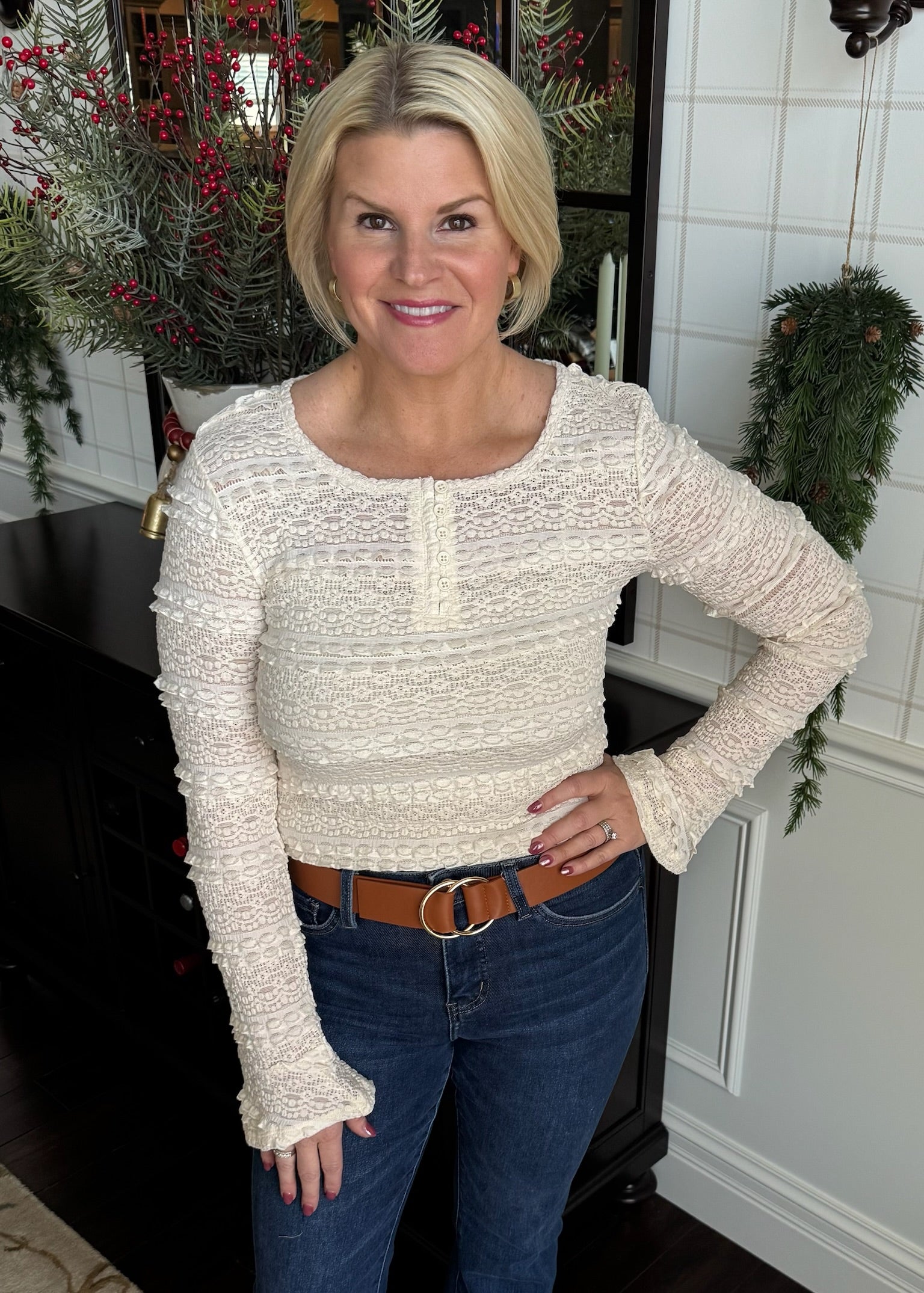 This cream ruffled lace button down is such a cute layering piece for winter!