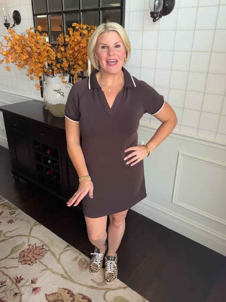 Love this split neck collared dress. It is the softest fabric ever! Such a fun piece to pair with your favorite tennis shoes and crossbody.