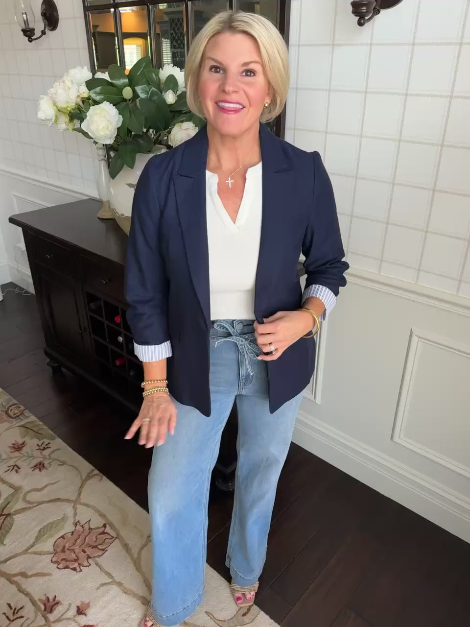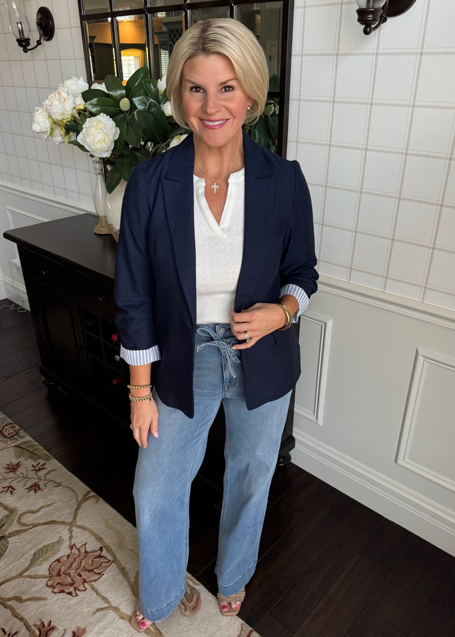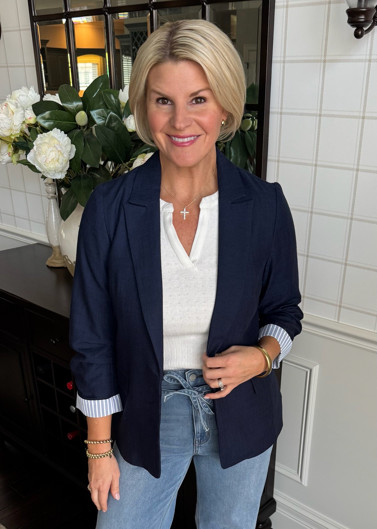 Super fun blazer with cinched sleeves and striped cuff. Front functional pockets. Great for date night or wear to the office.