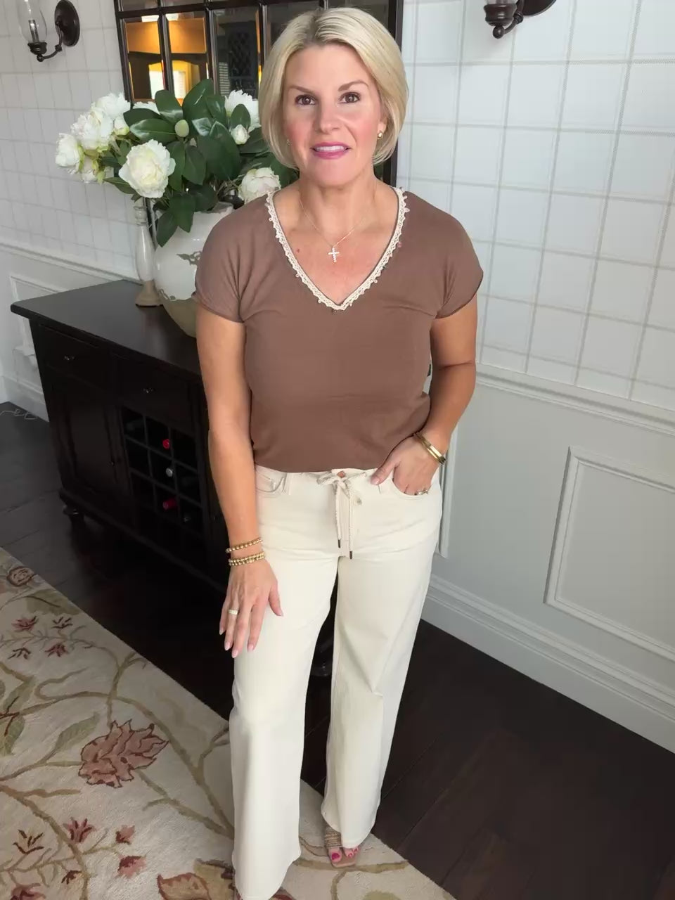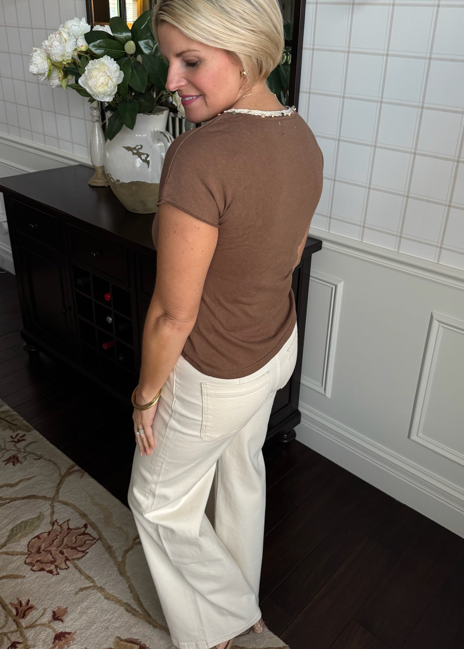 Love this chocolate tee with this cute crochet with cute little rock detail v-neck.
