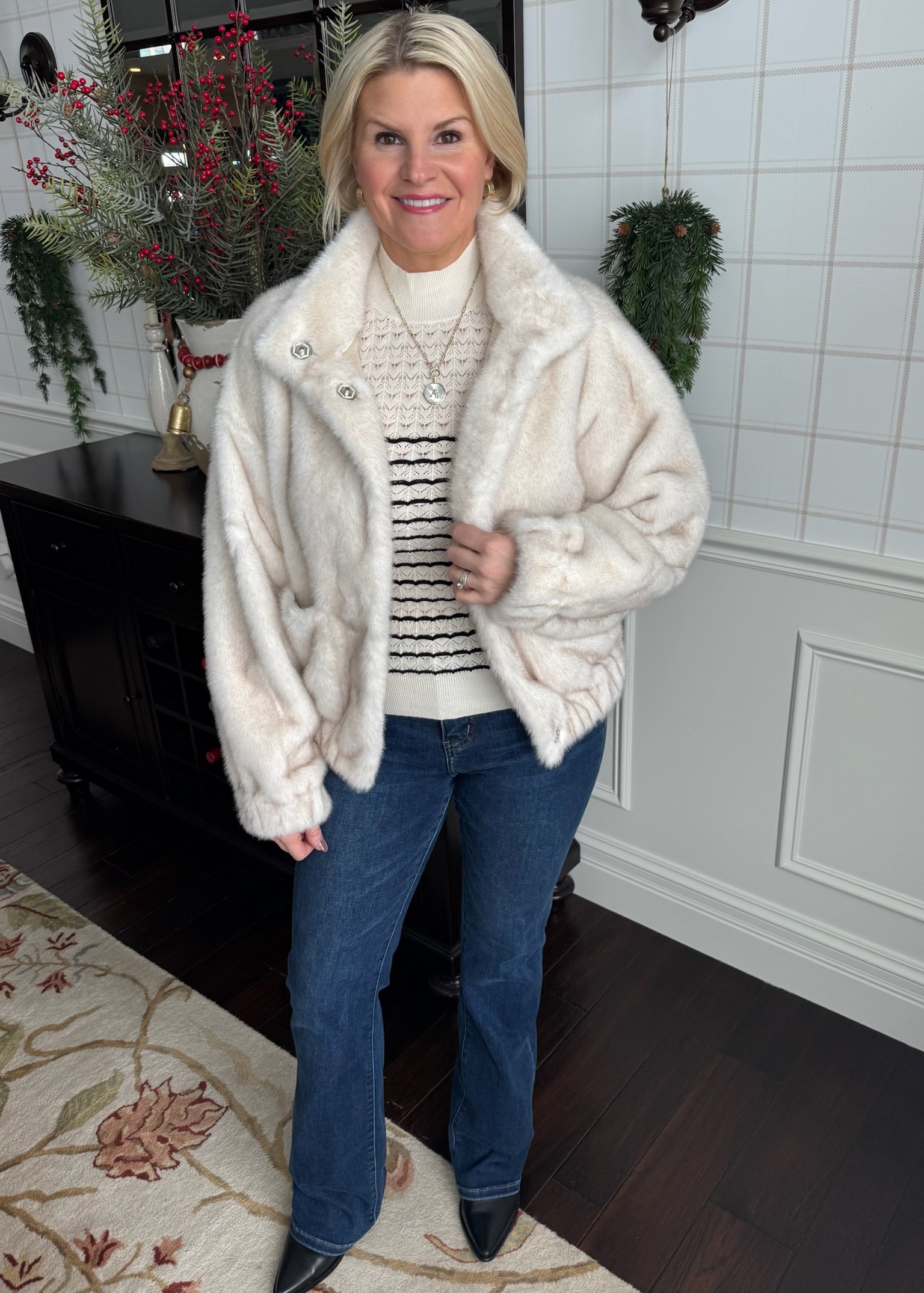 This beautiful almond cream fur is a winter staple! Features pockets and snap buttons.