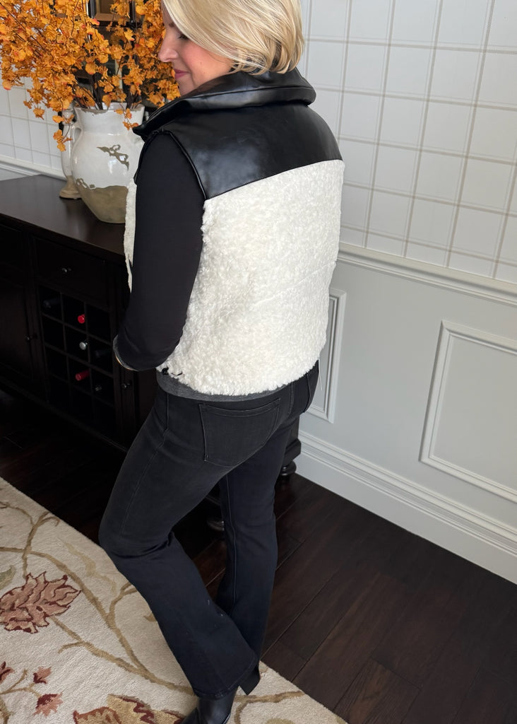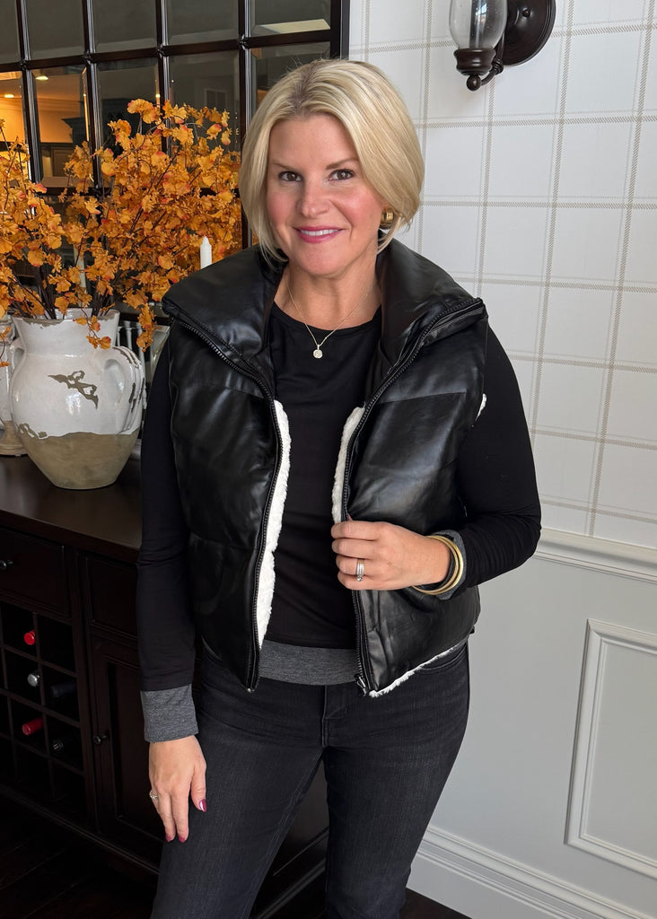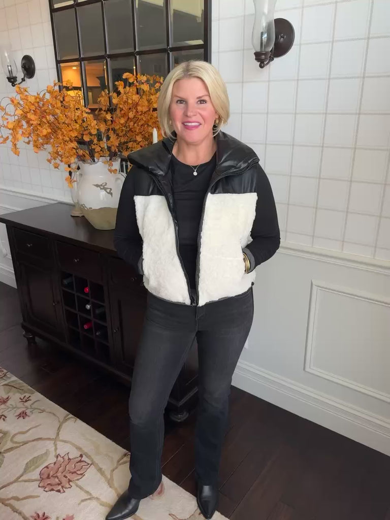 The quality on this vest is phenomenal! You can have a dressier vibe with the faux leather or a sportier look with the sherpa! Love the zipper pockets on the sherpa side.
