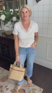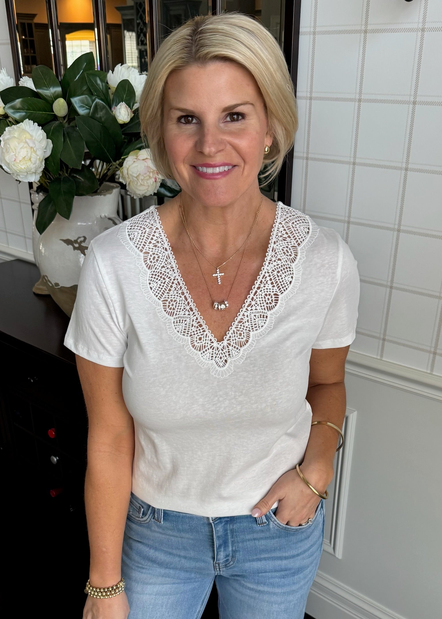 Love this basic white tee with the cute crochet neckline.