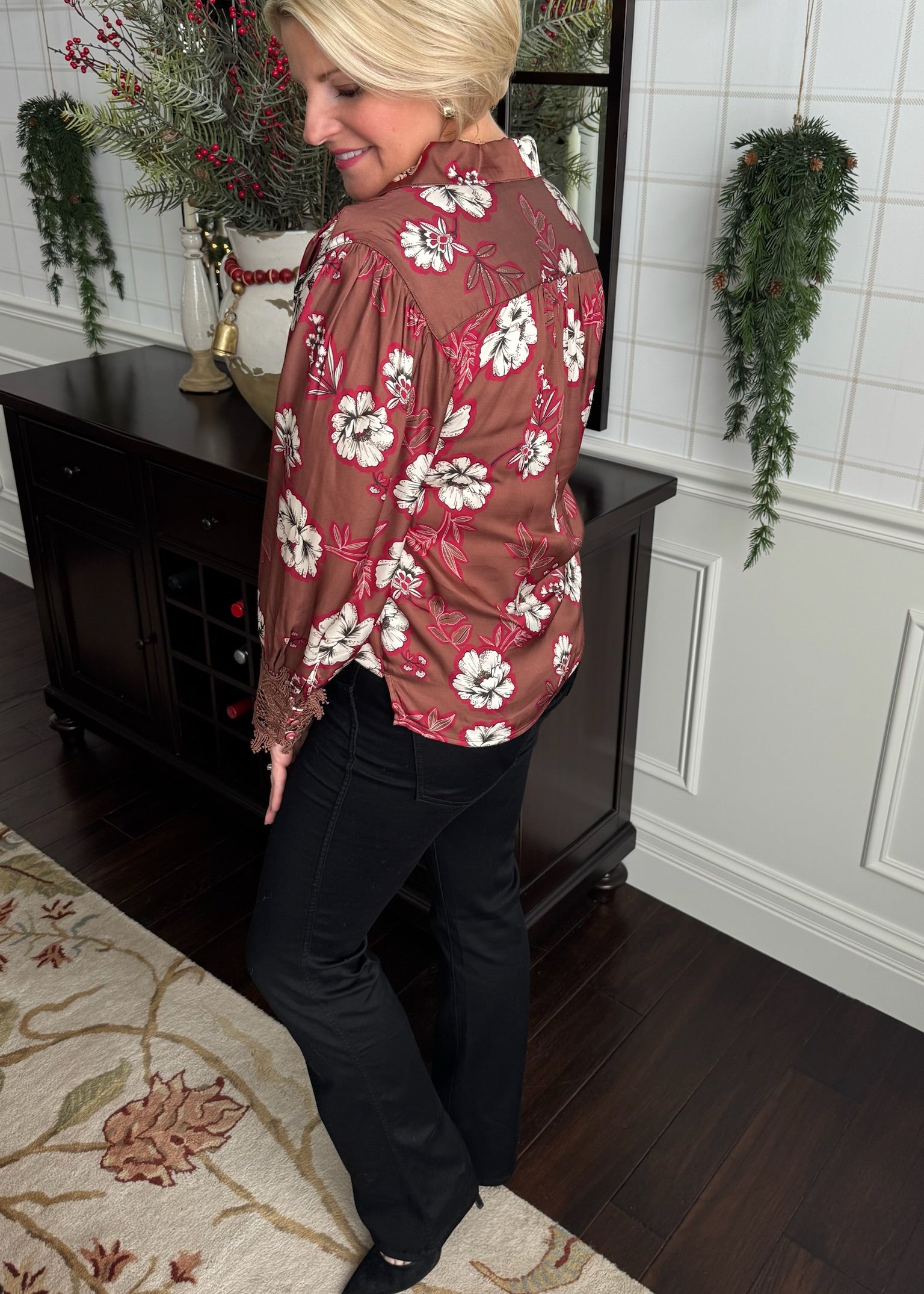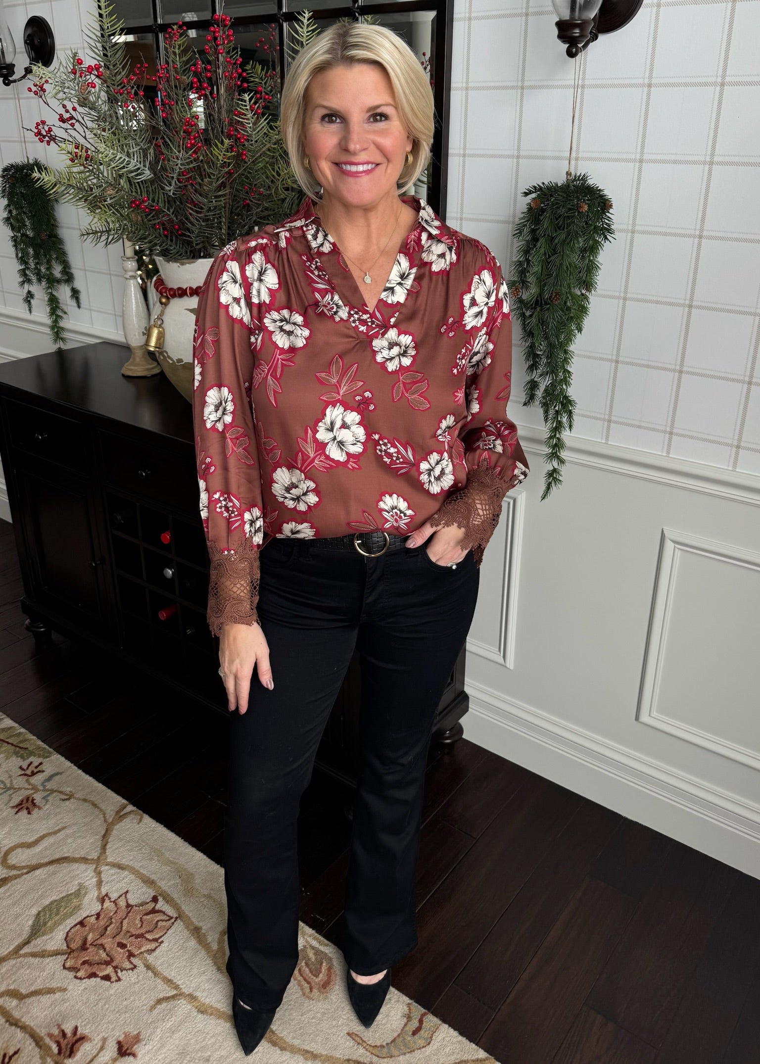 This beautiful silky top with the chocolate background and red and black flowers is great for Thanksgiving or Christmas. Features a beautiful lace cuff.
