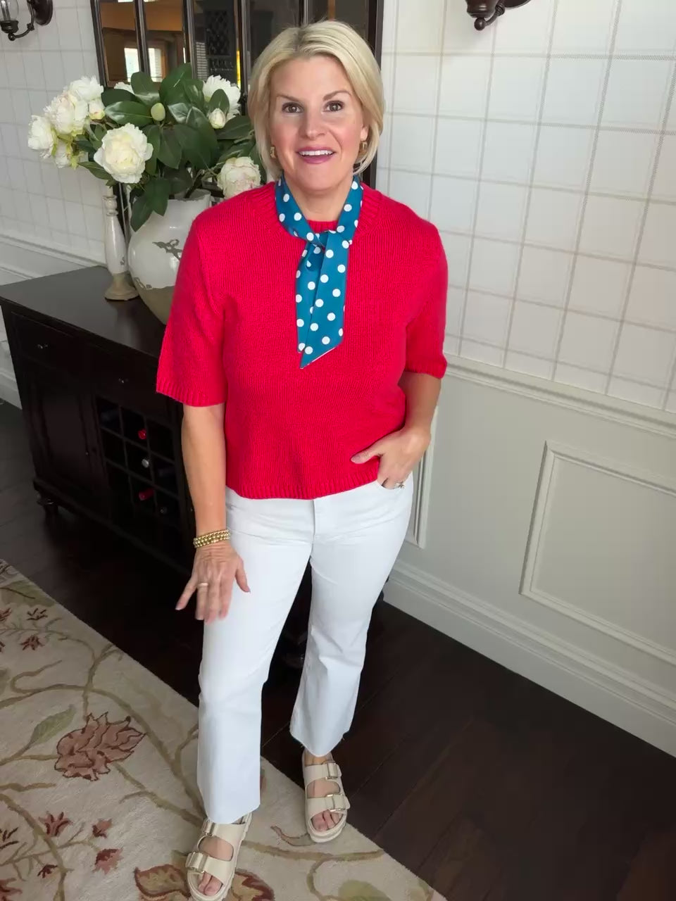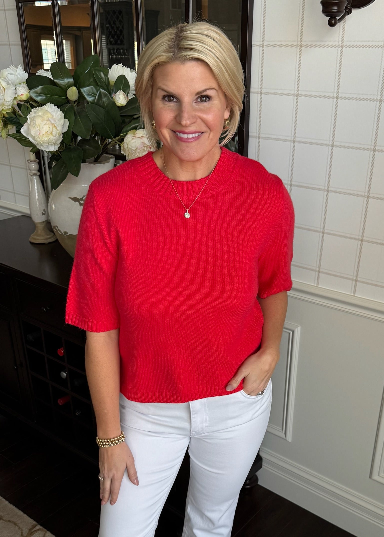 This shorter length soft sweater is a beautiful coral/red color. Love the split hems.