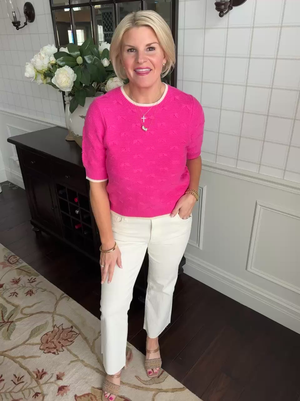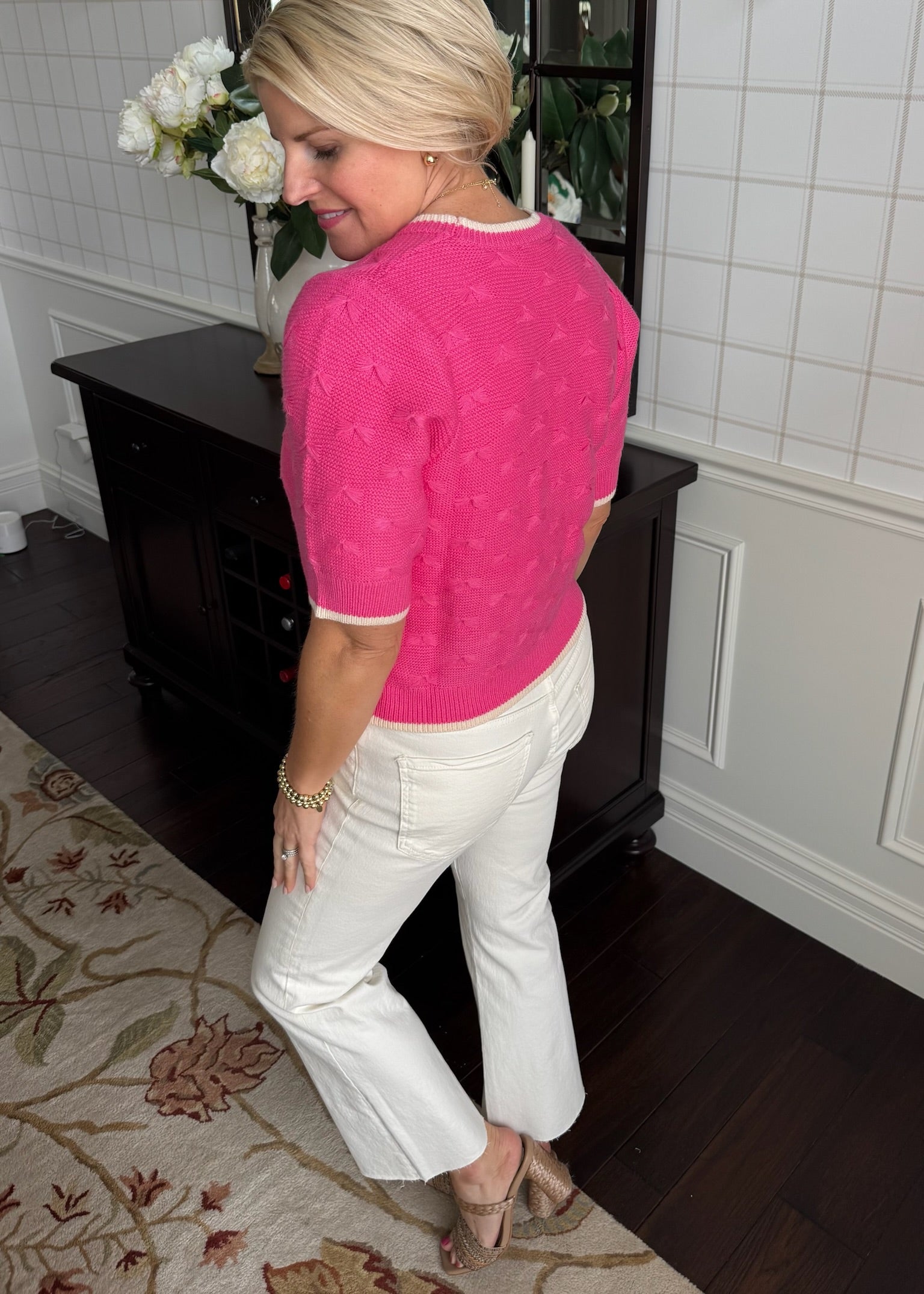This adorable pink sweater features cream color blocking and this cute little stitched fan detail throughout.