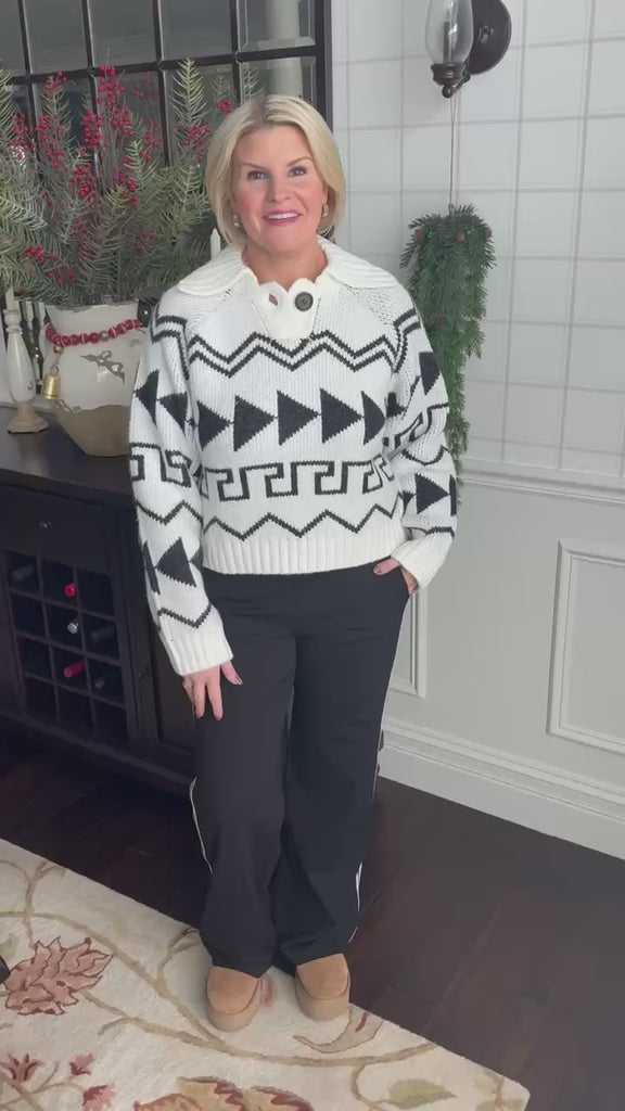 Bring on winter in this beautiful black and white fair isle sweater. Perfect for a ski vacation.