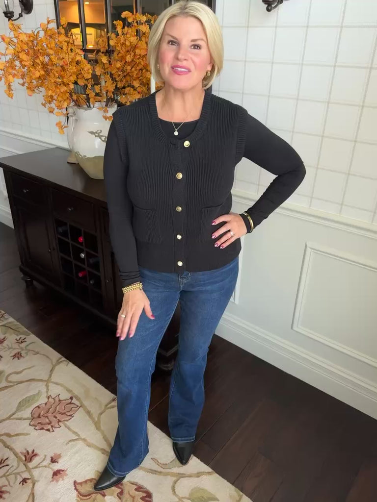This sweater features beautiful gold buttons. Love this with our metallic stripe black sweater.
