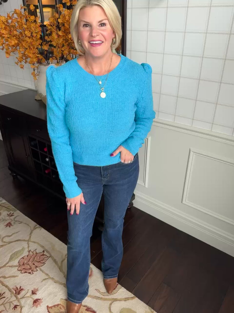 This super soft sweater features a textured fabric and a feminine shoulder.