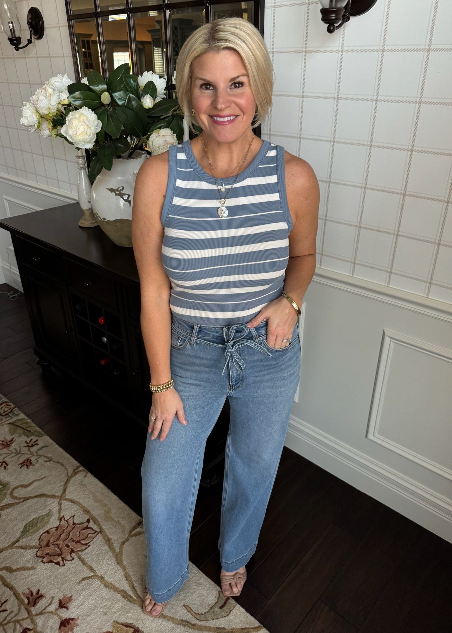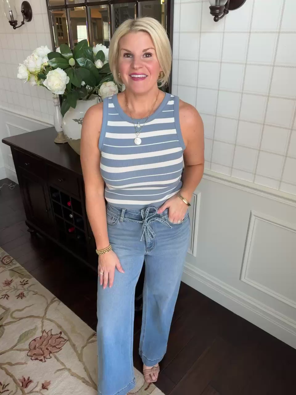 This ribbed blue and ivory stretchy ribbed tank is the perfect little layering piece.
