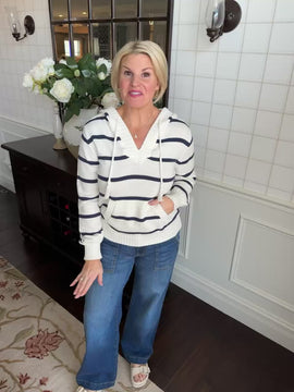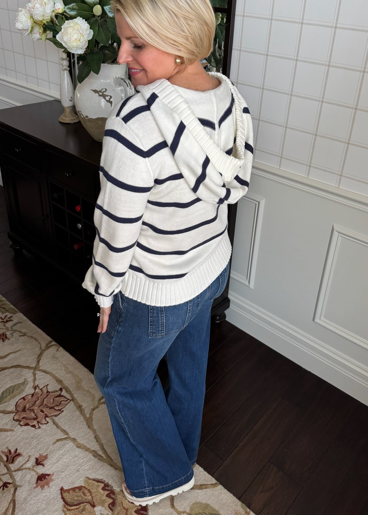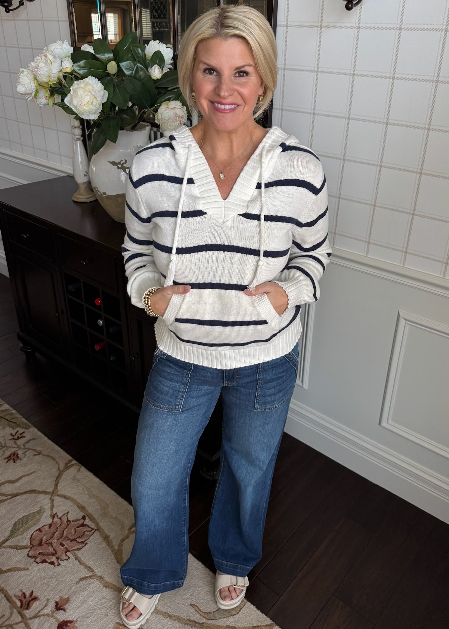 This ivory and navy striped v-neck hoodie is adorable! Love the tassels! Great with shorts on vacation.