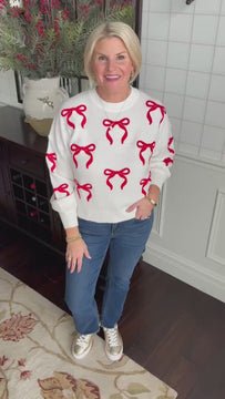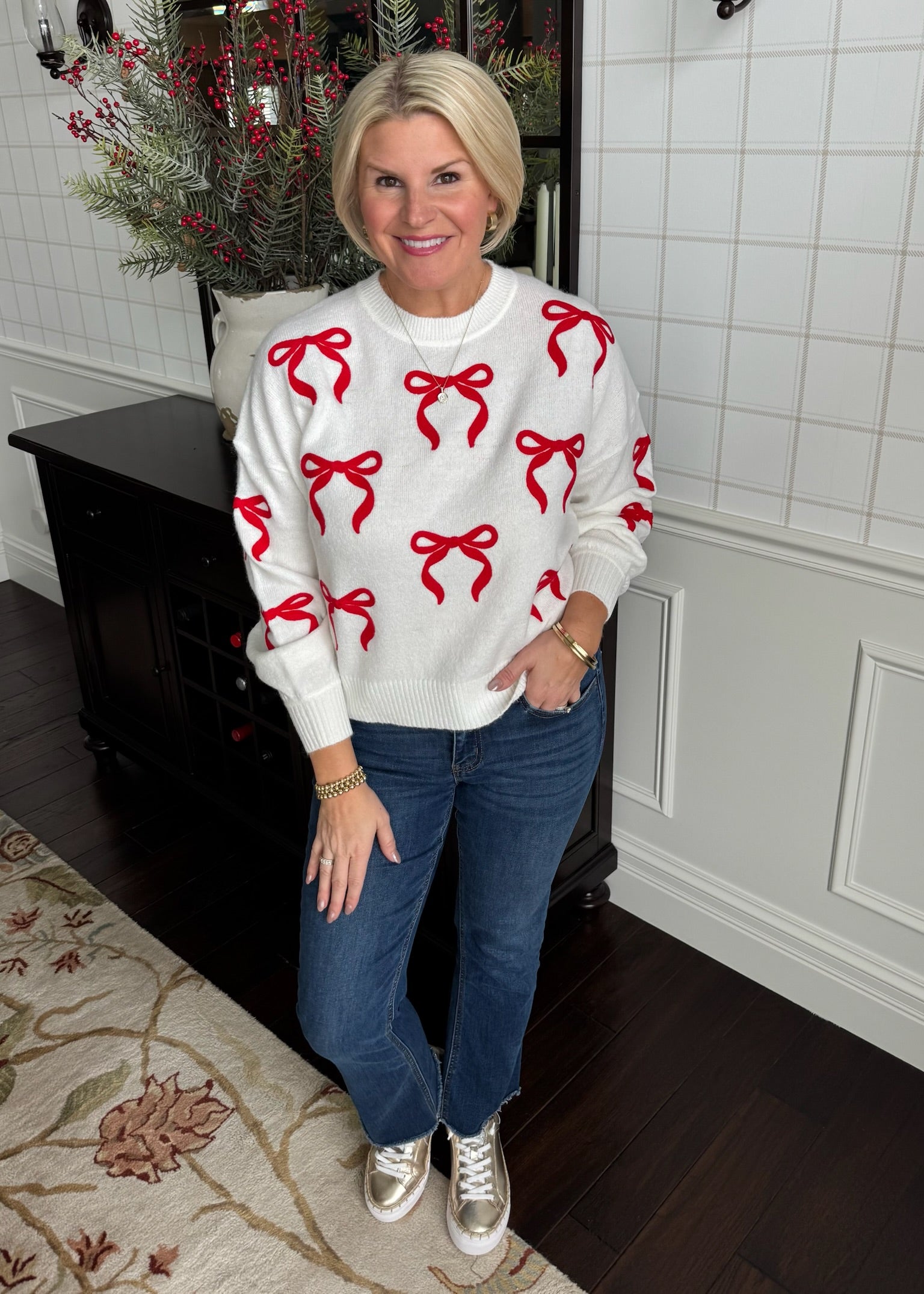 This stretch soft sweater features adorable red bows all over it. Such a cute holiday piece.