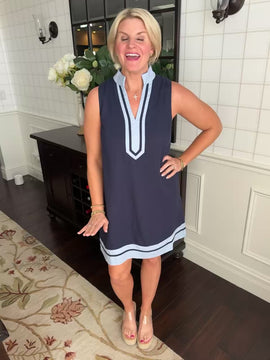 This dress is such a classic dress. I love the color combo with the light blue and navy! Such an easy fit and fully lined.