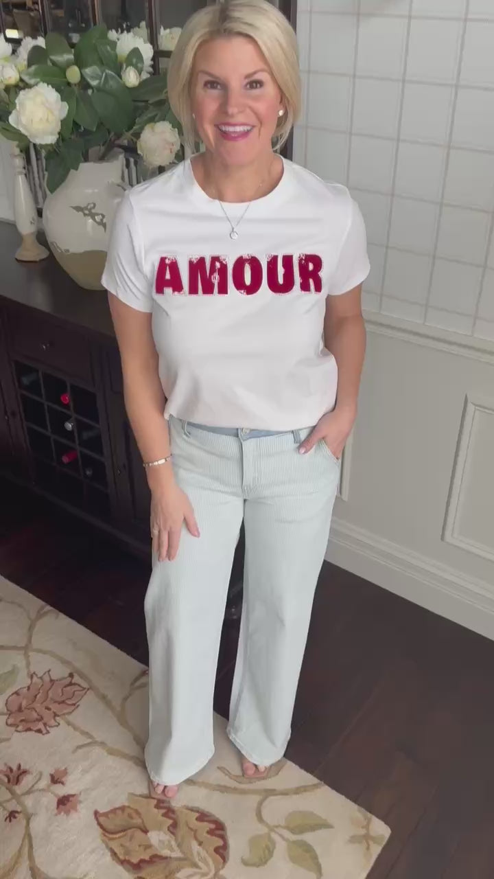 This white tee features a cherry lacquer velvet to touch Amour graphic with little rhinestone studs surrounding it. Such a fun tee!
