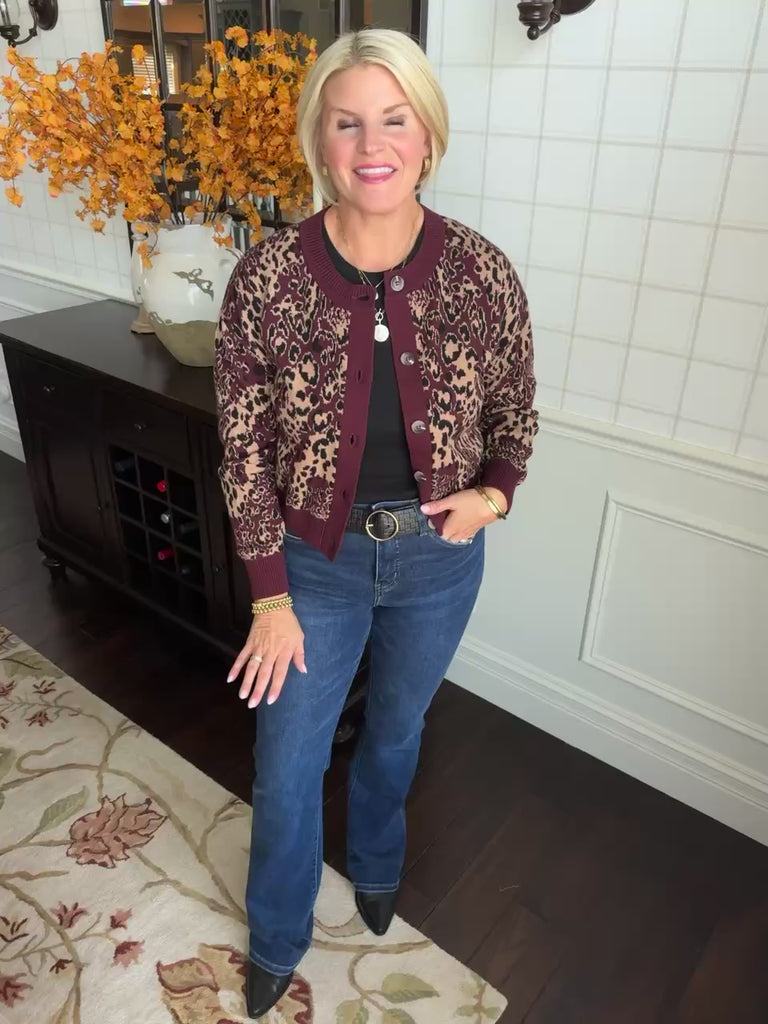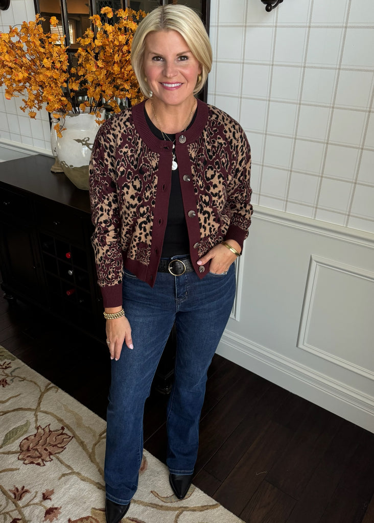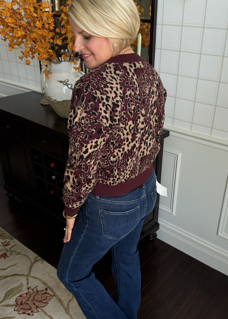Oxblood Cow Neck Leopard Cardigan - XS is backordered. It will be shipped when back in stock.
