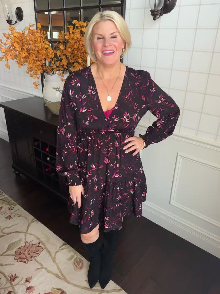 This black dress features a pretty pink and purple floral print. It's an easy fit with an elastic waist and smocked cuff sleeves.