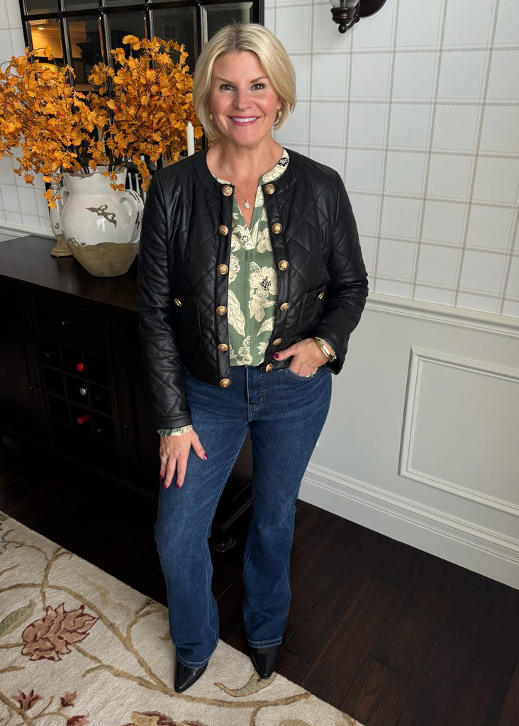 This brand new designer, Stellah, is known for their amazing details, stunning prints, and faux leather styles. This beautiful quilted leather jacket features the most stunning buttons and little pockets on the front!