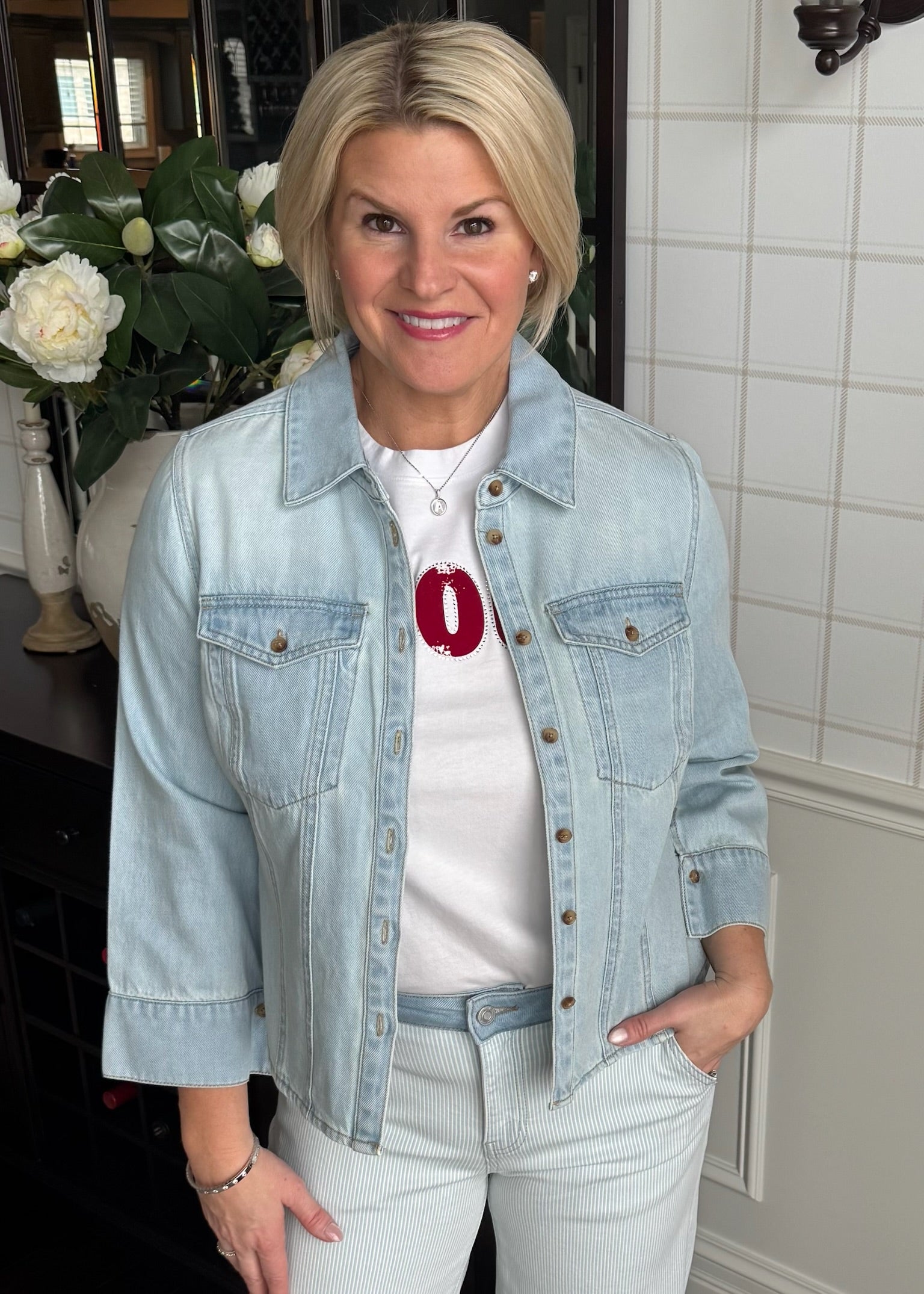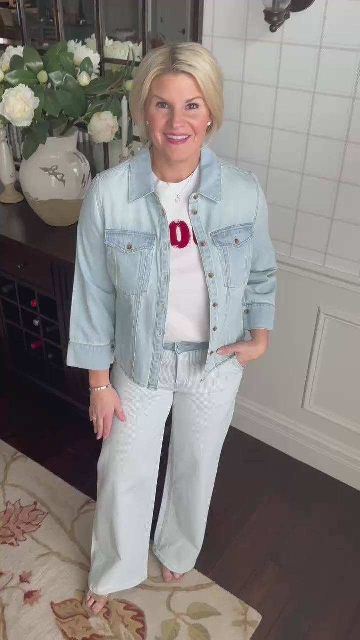 This adorable thicker button down acts as a more fitted shirt or a jacket layer. Love the wider sleeves and wash on this! So cute!