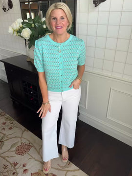 Blue & Orange Pointelle Short Sleeve Button Down Sweater - Small is backordered. It will be shipped when back in stock.