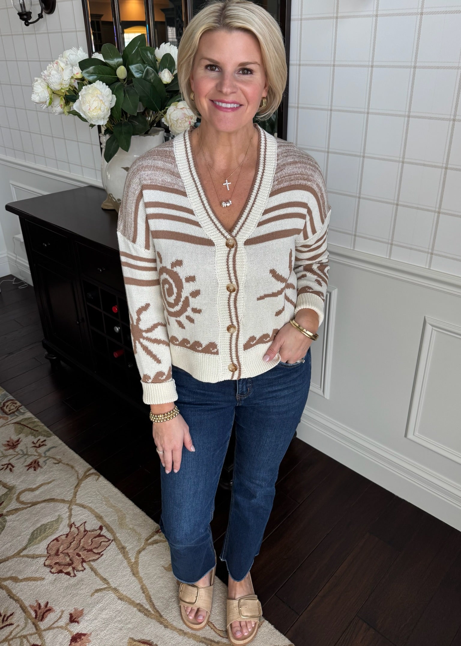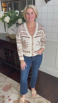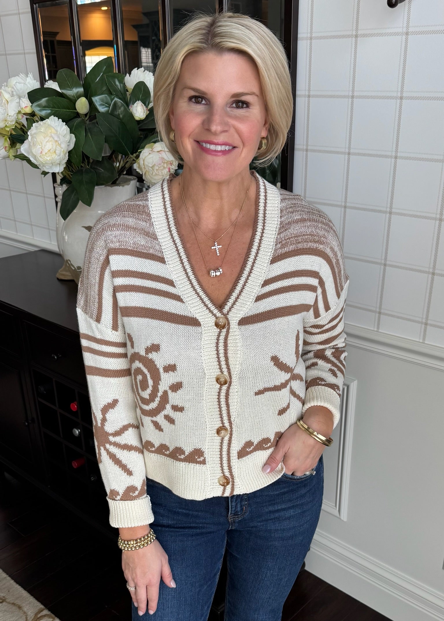 This sandy beach inspired cardigan features a classy blend of tan and cream! So cute with denim shorts and a tank.