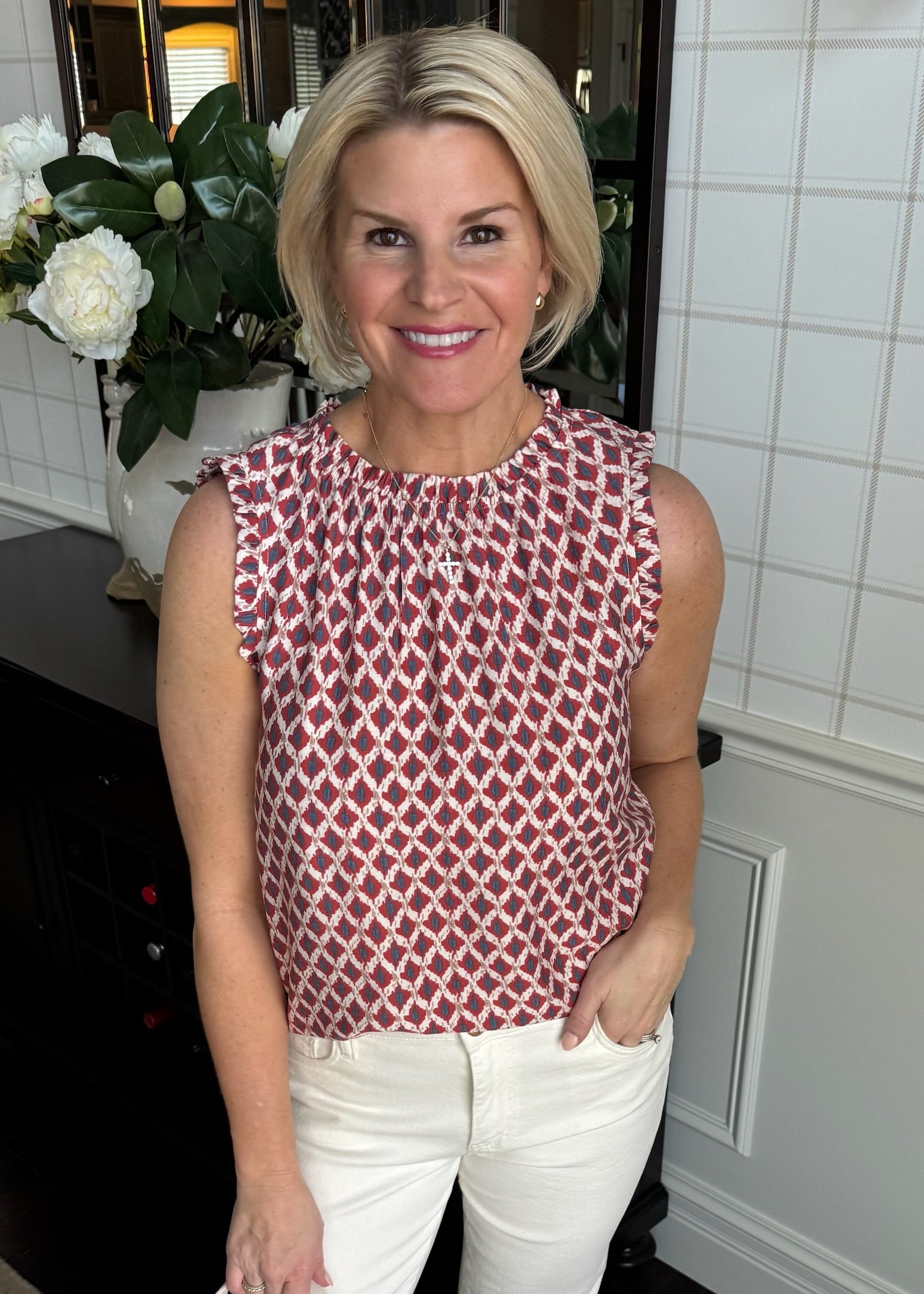 Fun burgundy and navy print that will make you a standout in any crowd. Sleeveless with a small ruffle at the neck and armhole for all those warm summer days.
