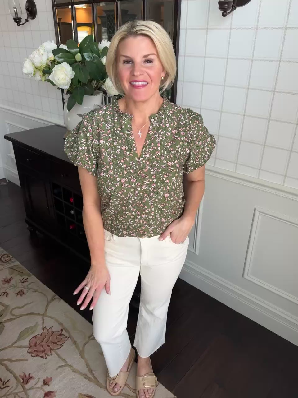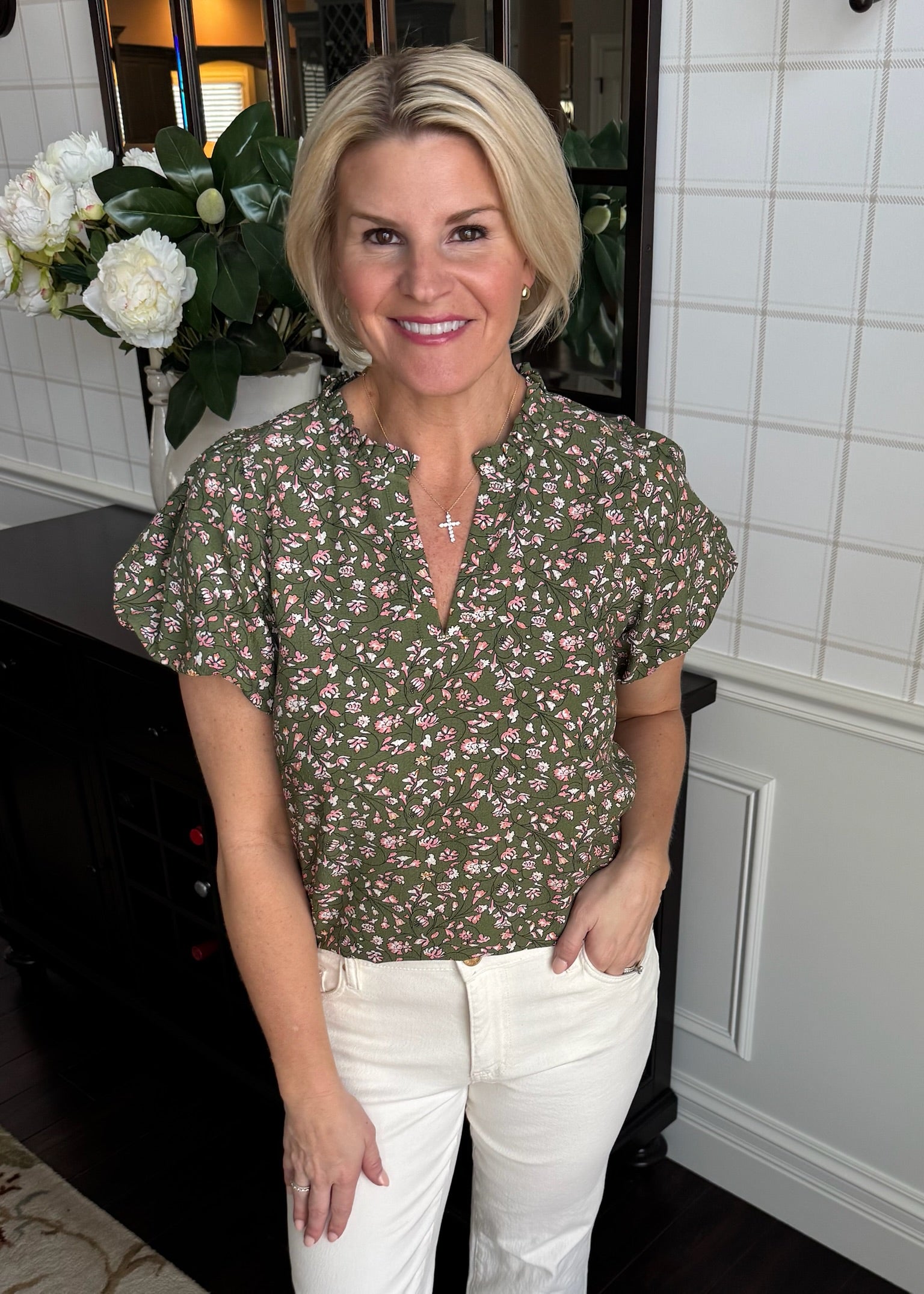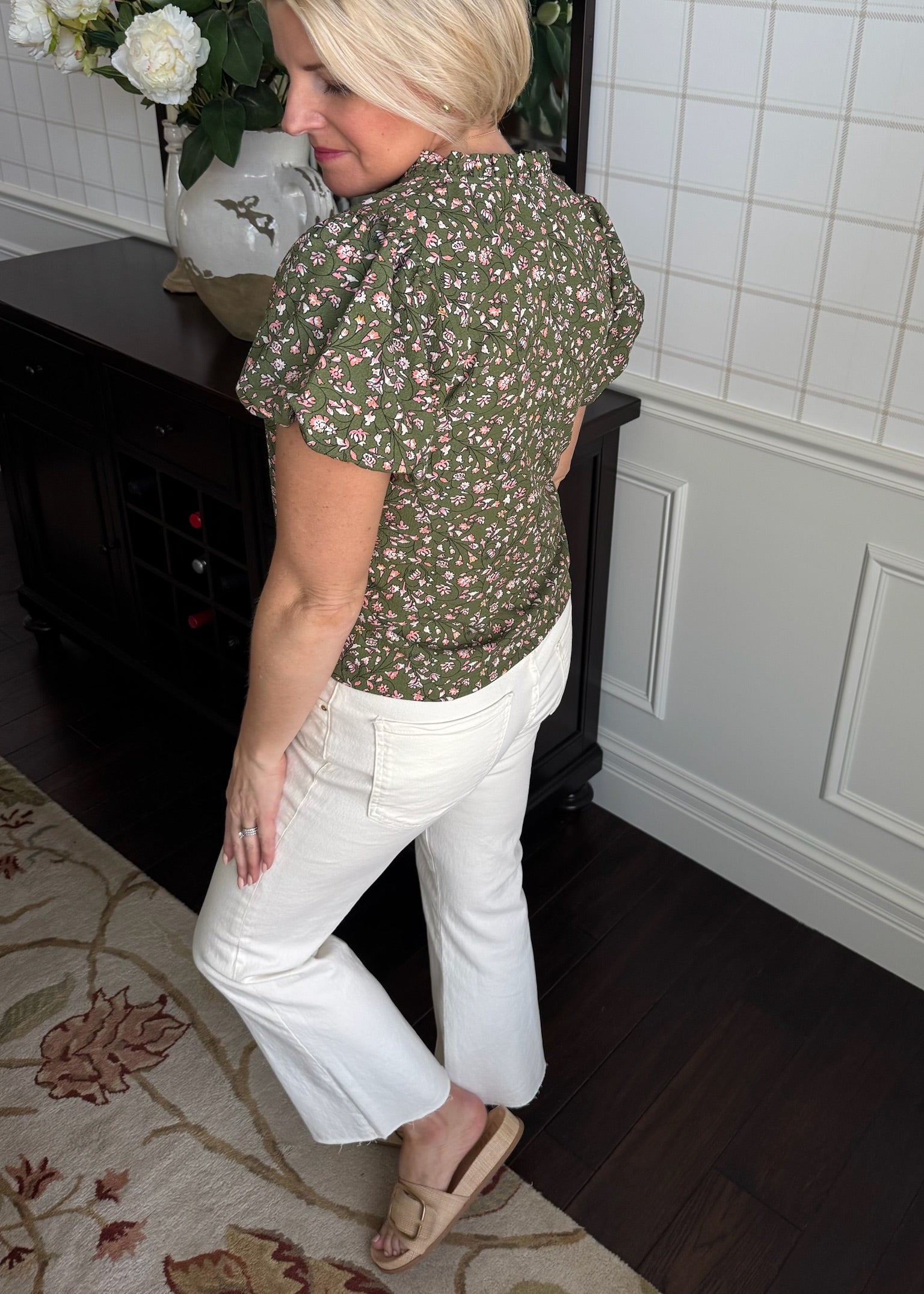 Olive Ruffle Floral Print Top - Small is backordered. It will be shipped when back in stock.
