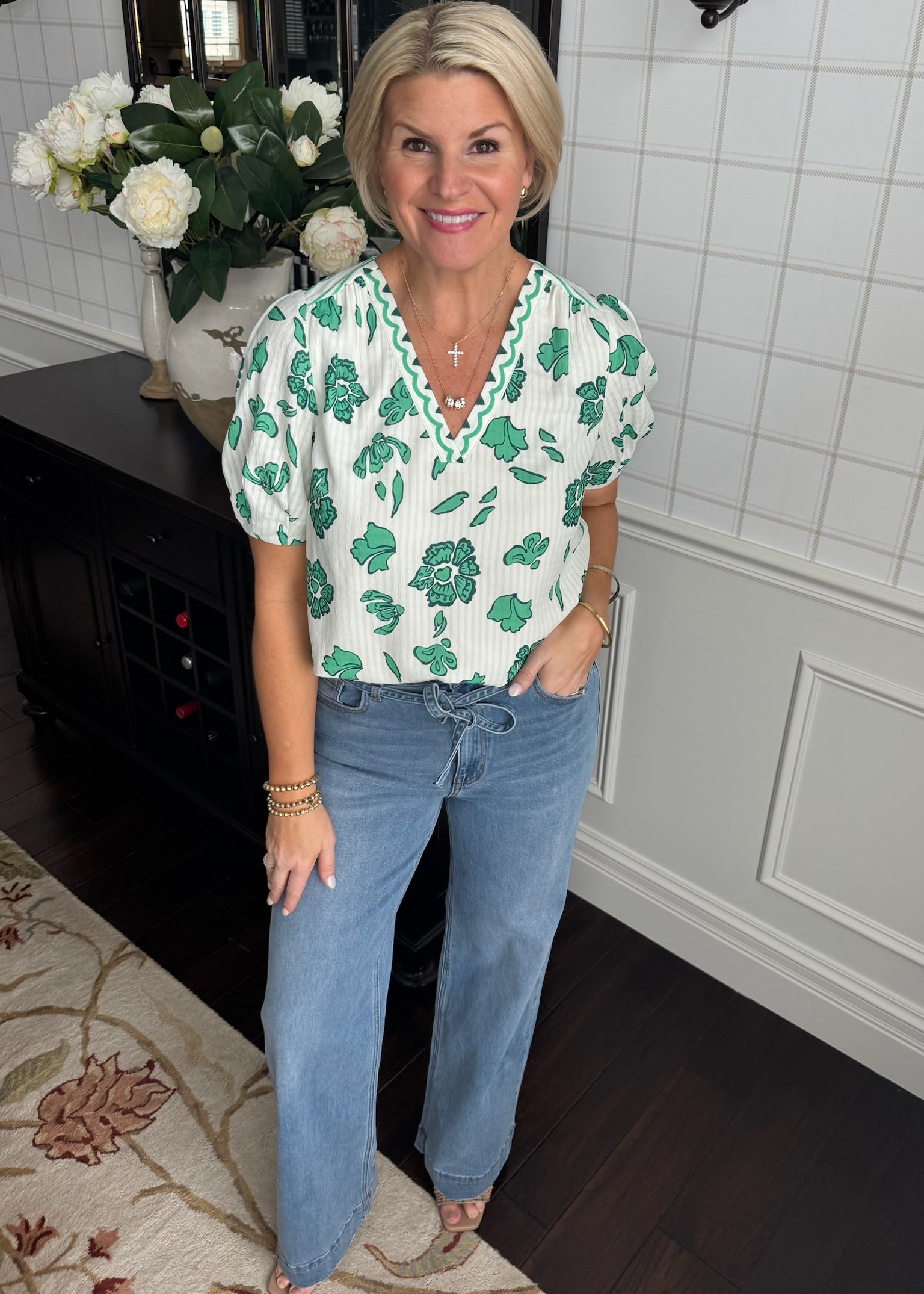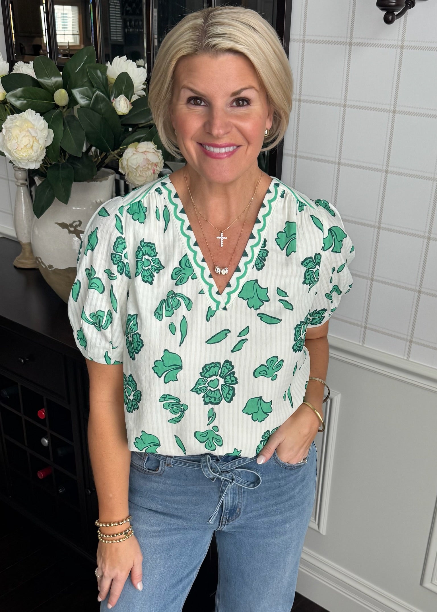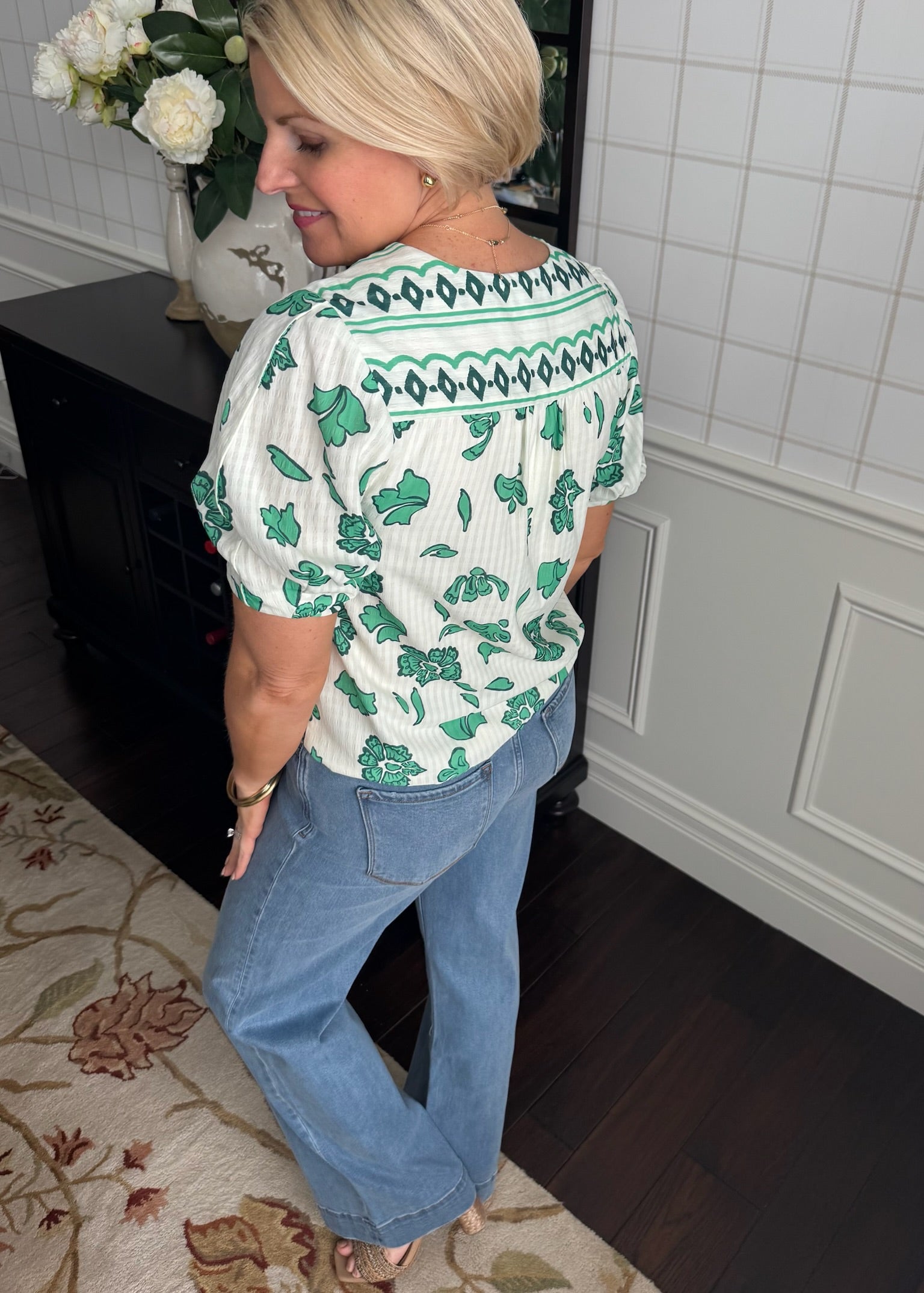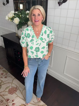 This fully lined top features an adorable green floral print. So cute with denim.