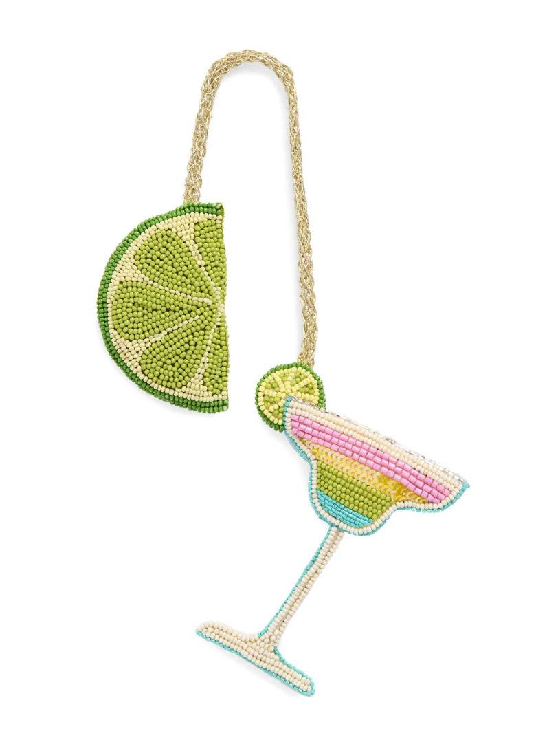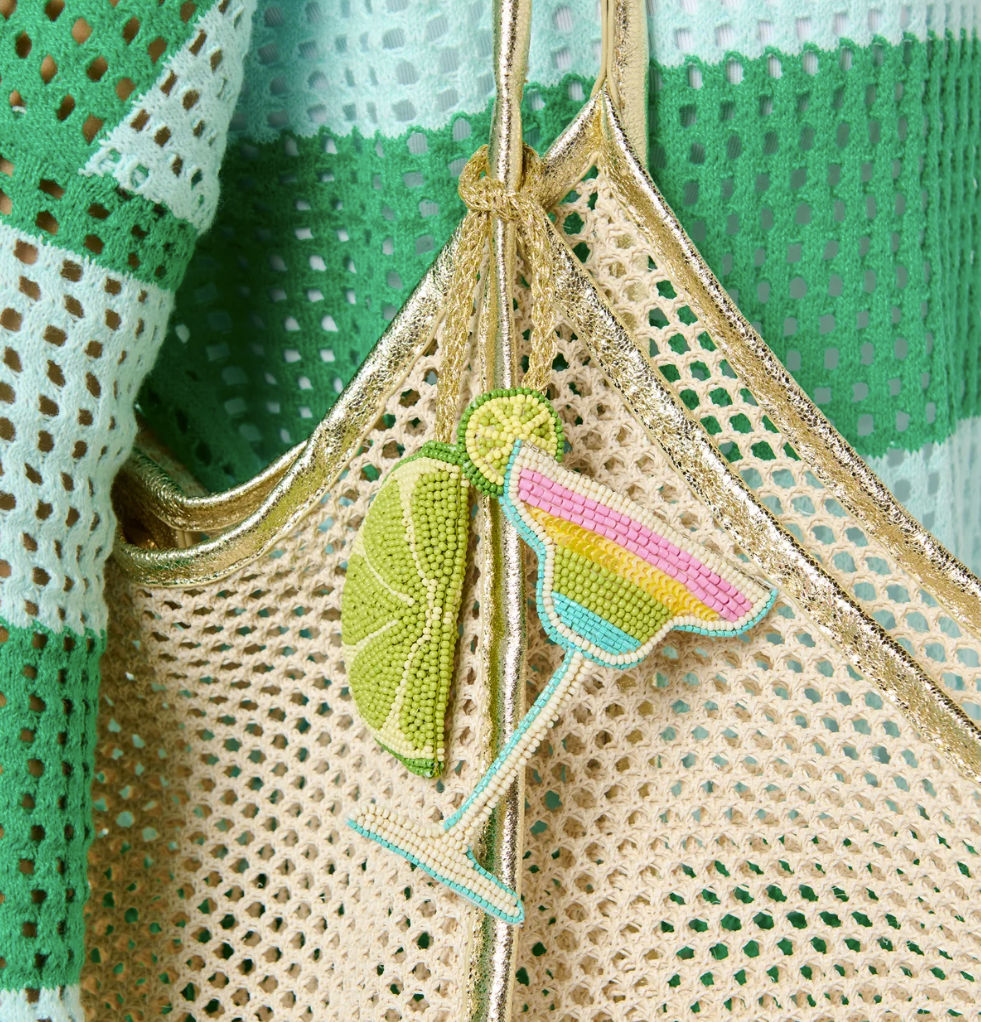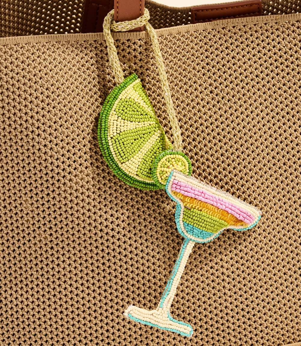 Add a splash of fun to your bag with our Lime/Margarita Beaded Bag Charm. Featuring a vibrant green lime slice paired with a pastel margarita glass, this charm brings vacation vibes wherever you go. Detailed with intricate beading and bold tropical flair, it's the perfect finishing touch for your beach tote or everyday carry. With its cheerful design and easy loop attachment, this charm instantly lifts your mood and your style.