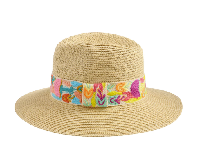 Nova hat is crafted from paper straw and features a wide band with vibrant embroidered trim in bold tropical hues.