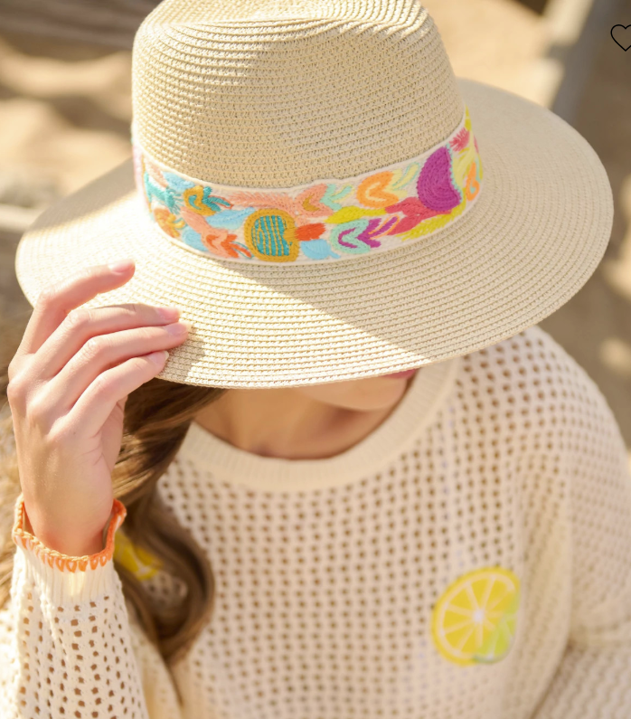 Love this adorable sun hat with the beautifully colorful embroidered band.