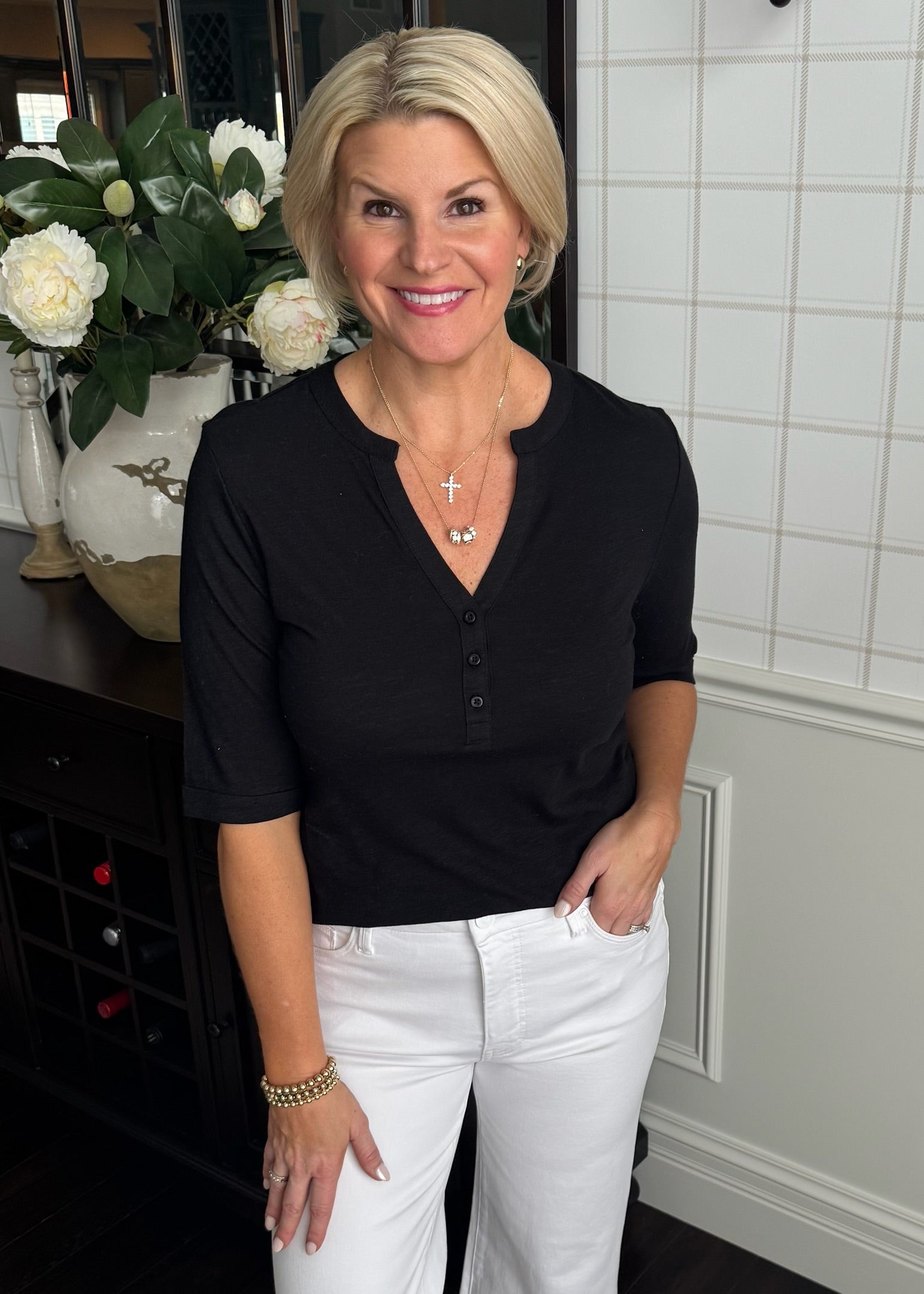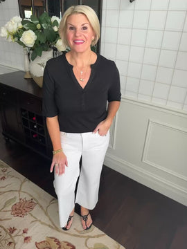 This simple black tee with the buttons down the v-neck and longer sleeves is so flattering! A great staple.