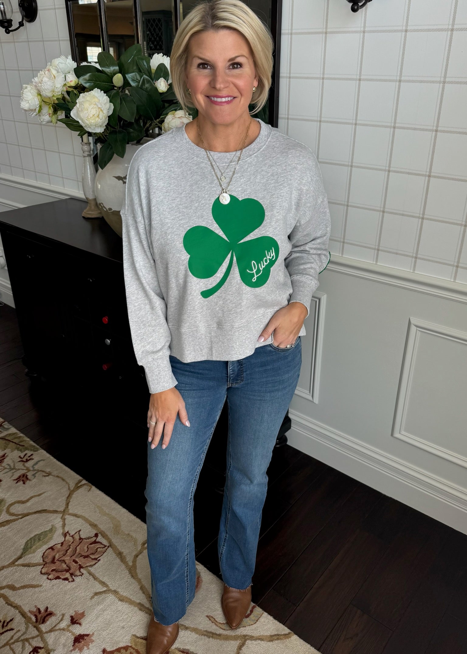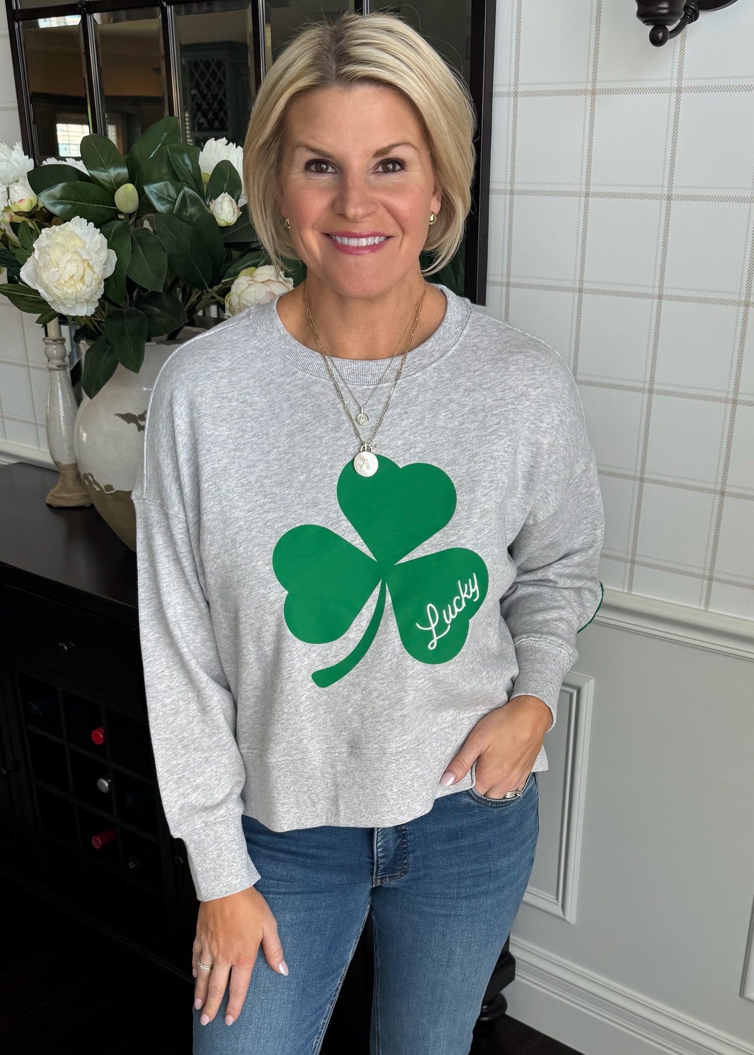 This adorable cotton sweatshirt features a textured shamrock on the elbow and slits up the side. Such a fun piece.