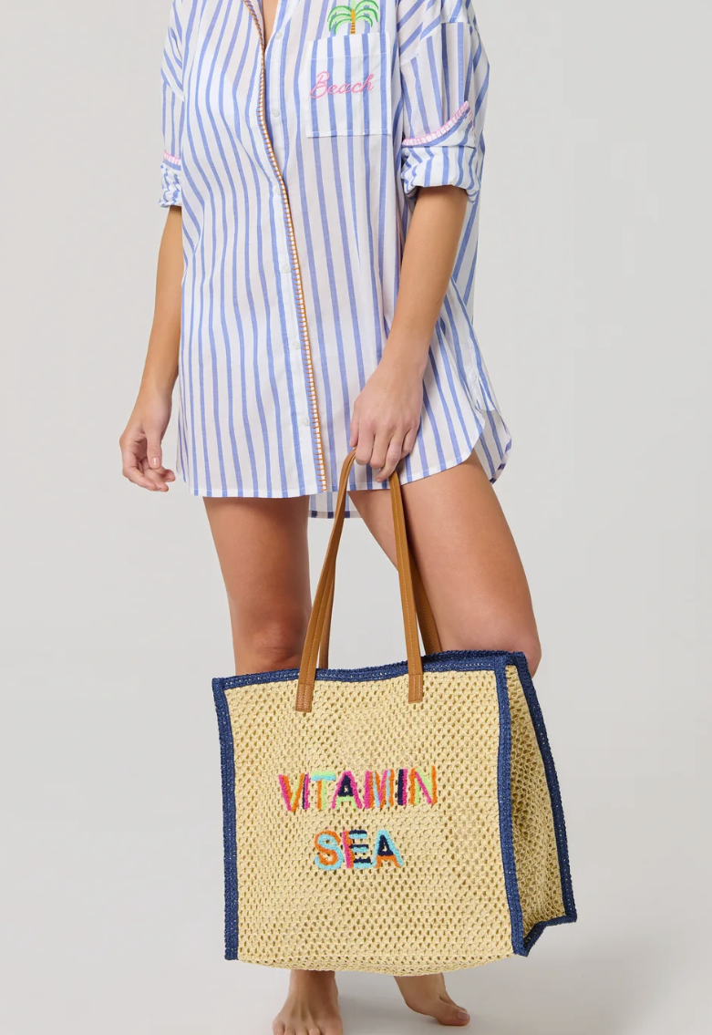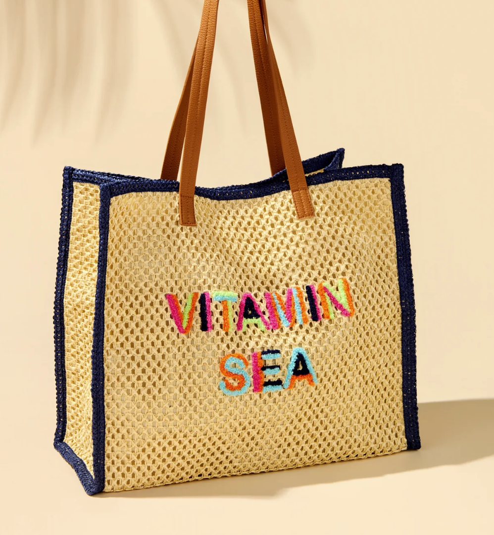 Soak up the sun in style with our "Vitamin Sea" Tote. This breezy open-weave bag features colorful embroidered lettering, double shoulder straps for easy carrying, and a magnetic snap closure to keep your beach-day essentials secure. Finished with a structured silhouette and a convenient inner slip pocket, it’s both cute and functional. Whether you're headed to the boardwalk or the beach, this tote brings the sunshine with you.