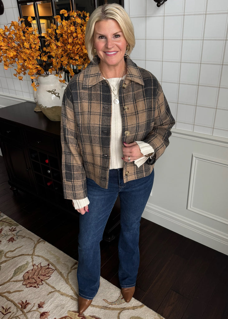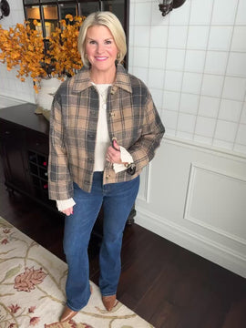 This mocha and black plaid jacket is so darn cute! Perfect shorter hip length with pockets. Such an outfit maker. Features a nice lining.