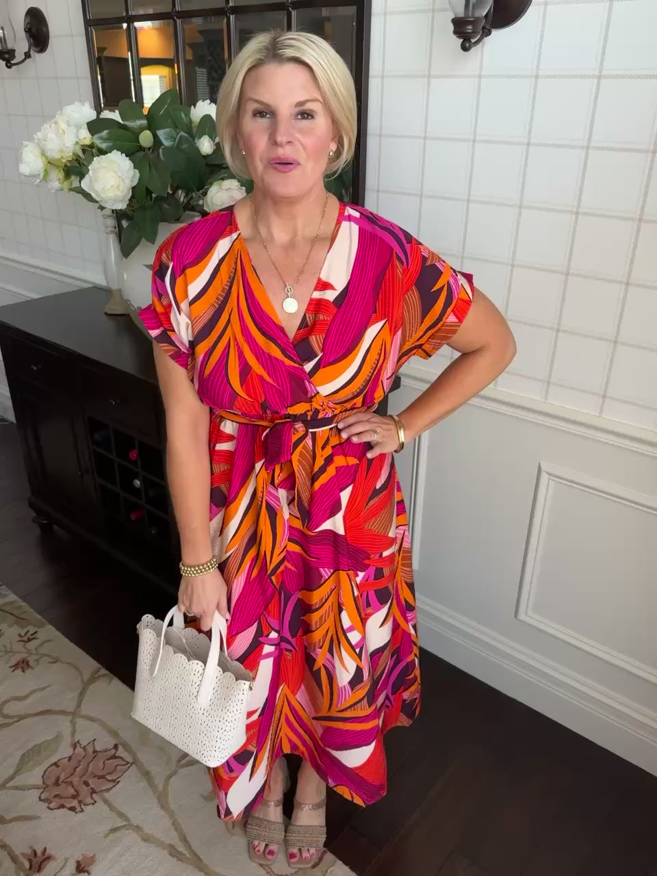 This super flattering midi dress features an elastic waist line with a wrap tie. So cute on! Great for your next vacation.
