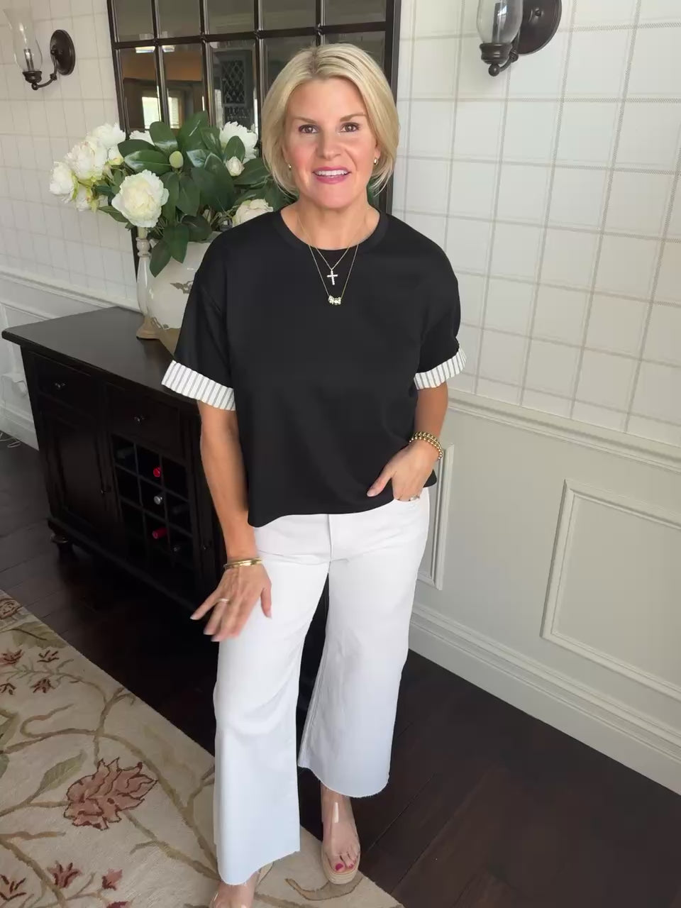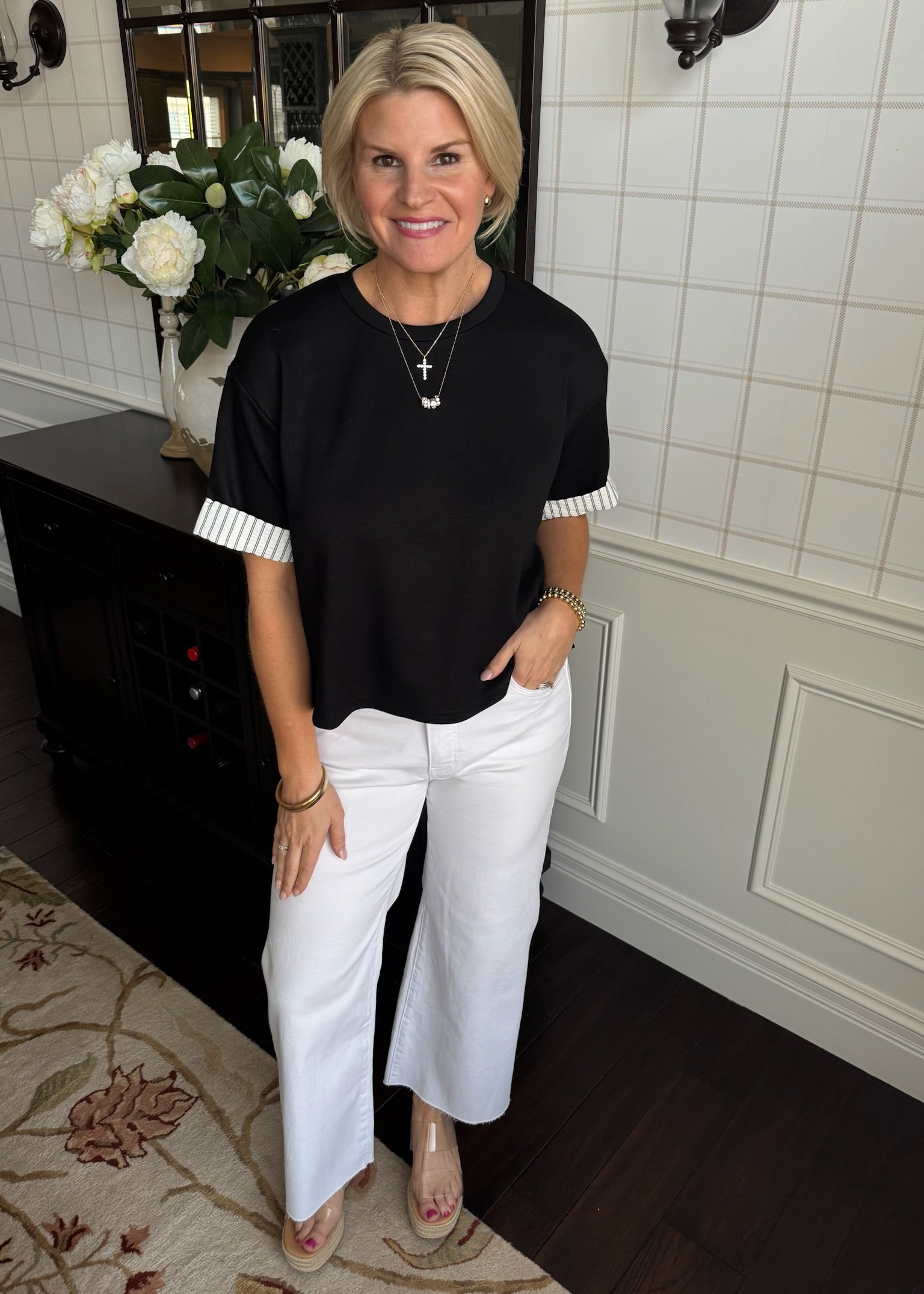 This super soft scuba like material features a poplin stripe black and white stripe sleeve. This is the cutest basic.