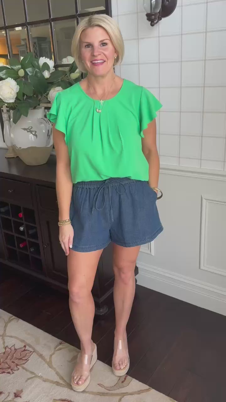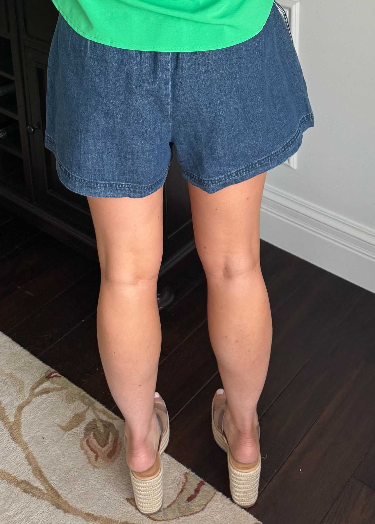 Love these darker denim shorts. Features pockets and a forgiving elastic waist.