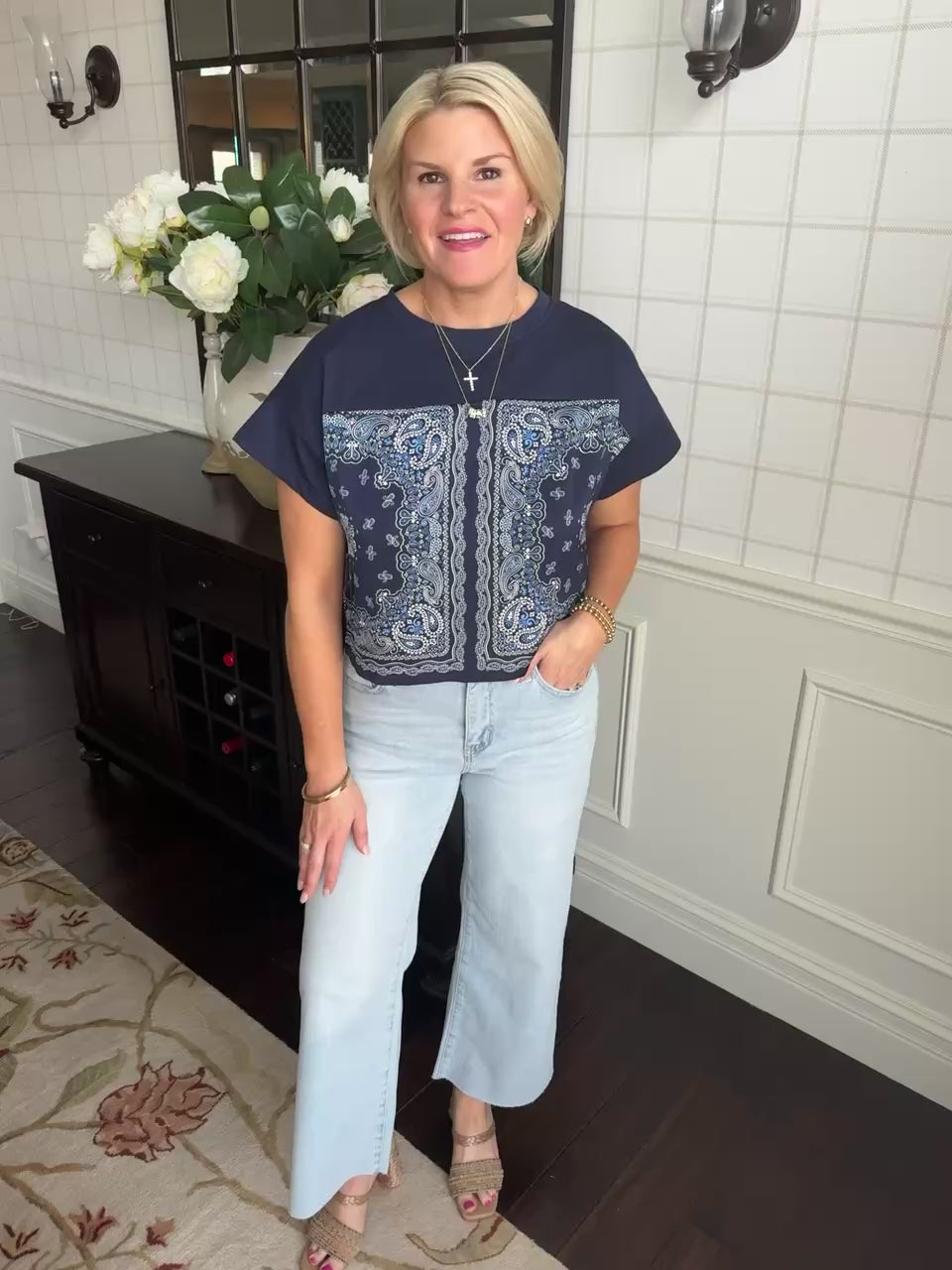 This adorable bandana top is such a cute tee! Love it with white and light denim!