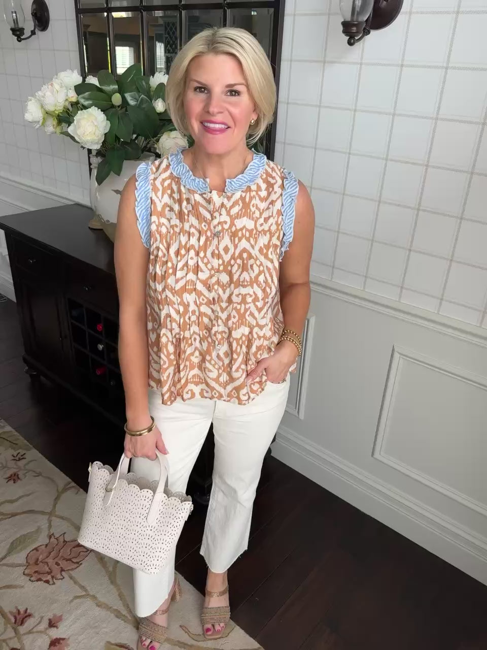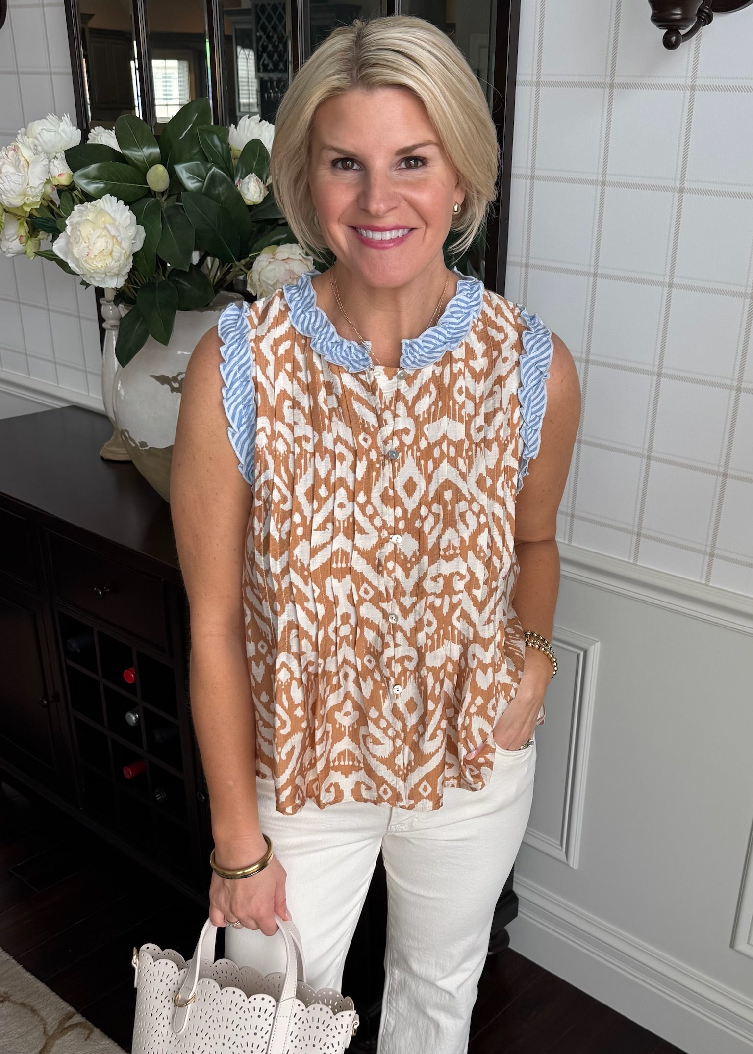 Sleeveless Rust, Cream, And Blue Accent Top - XS is backordered. It will be shipped when back in stock.