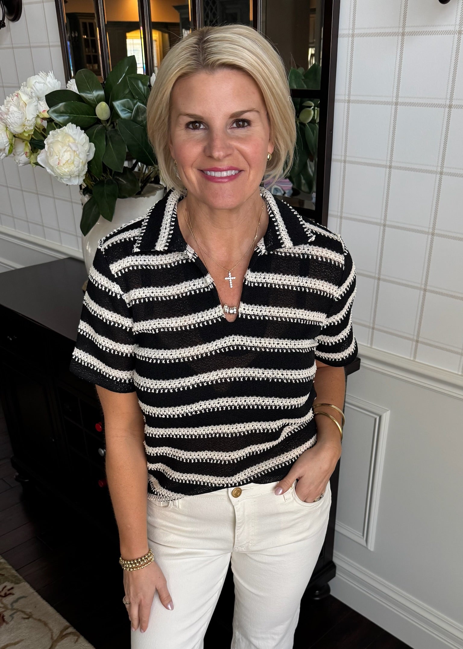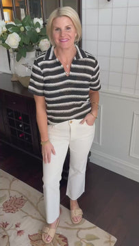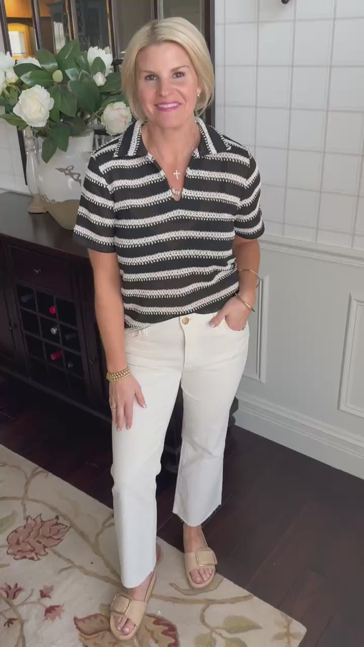 Lightweight, knitted black and ivory stripe short sleeve with collar. Split neckline.
