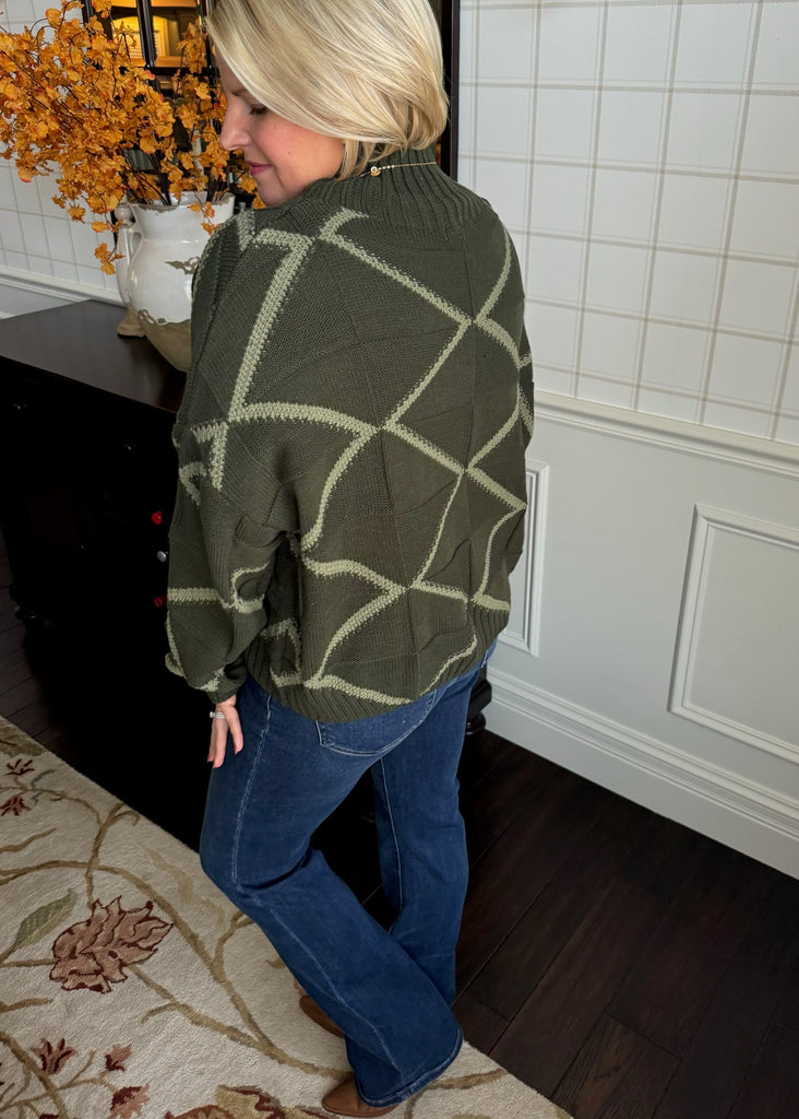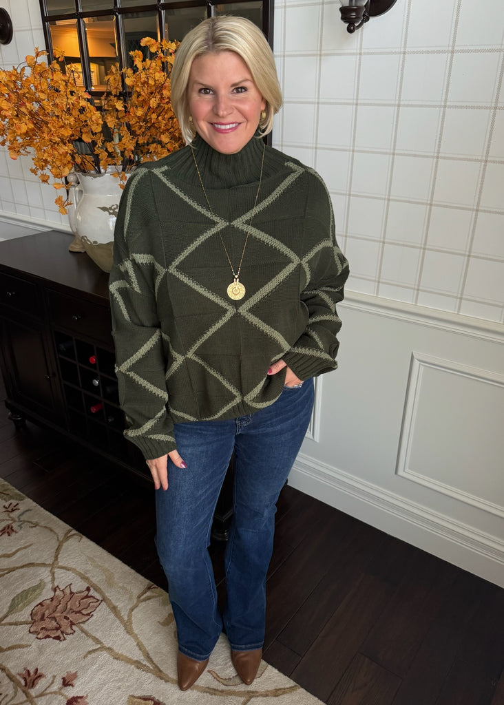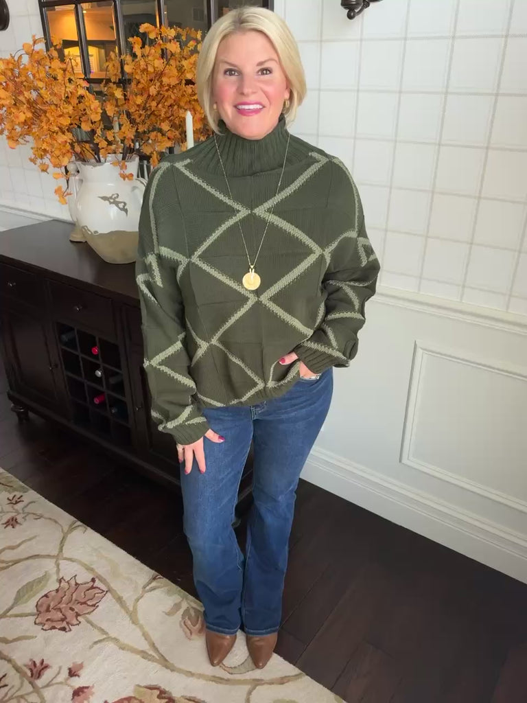This boxy fit sweater is adorable with the contrasting green colors and mock neck.