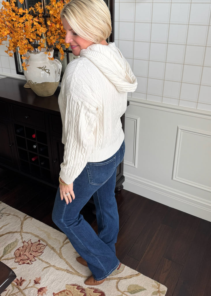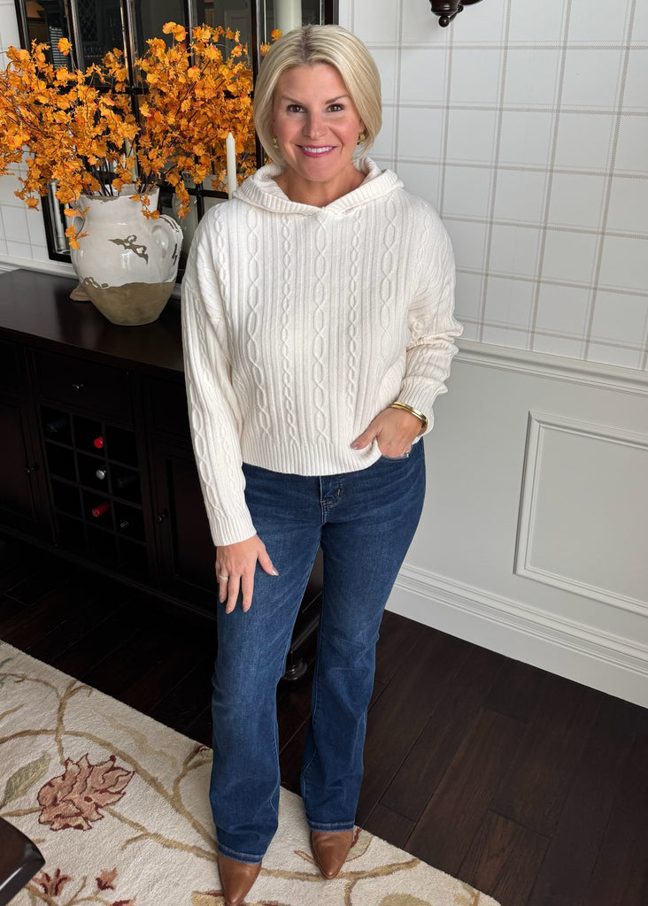Absolutely love this cable knit hoodie! Such soft an easy sweater you can dress up or down.