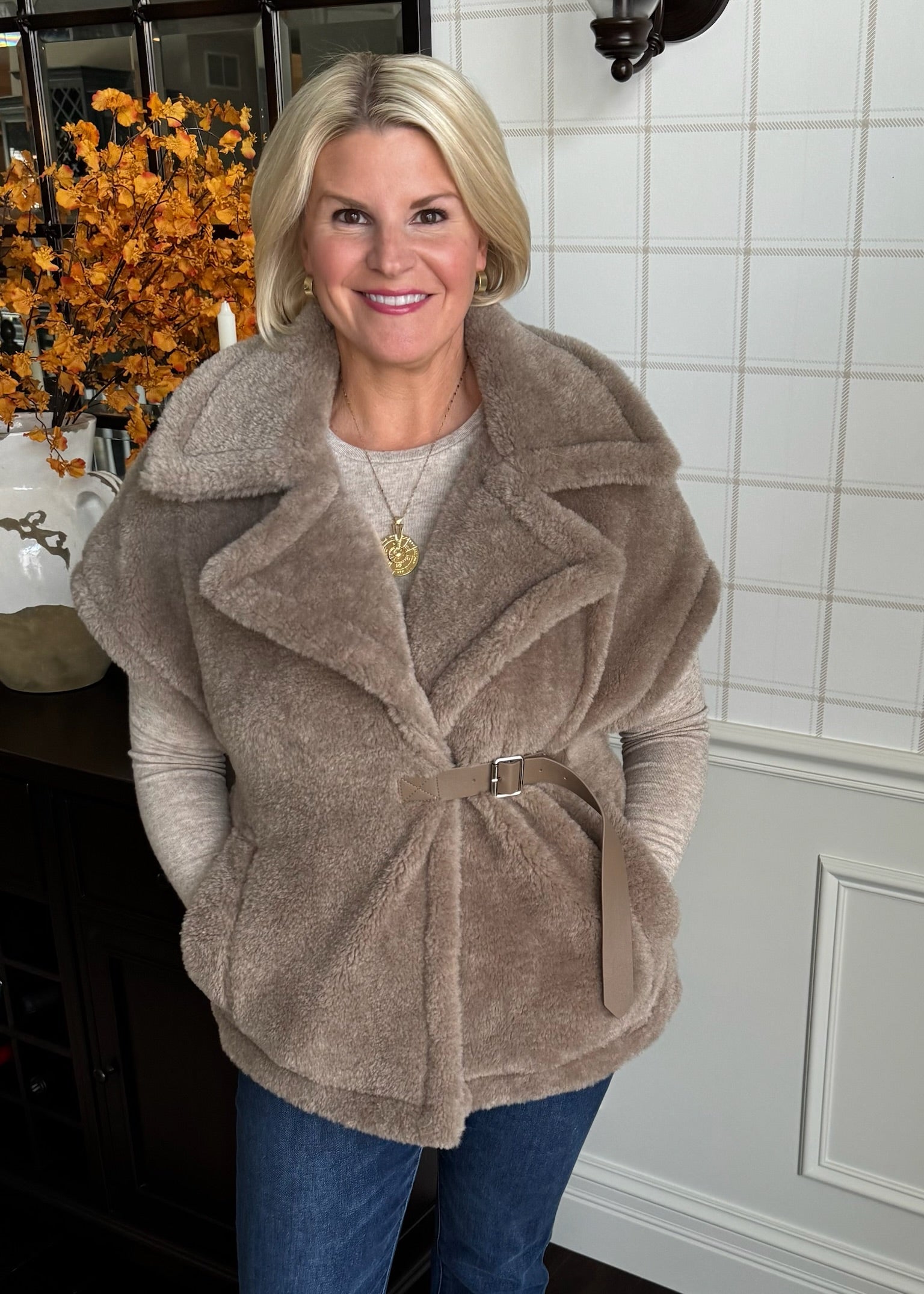 This soft fur vest features a belt cinching buckle, elastic waist and pockets! Such a great outerwear piece.
