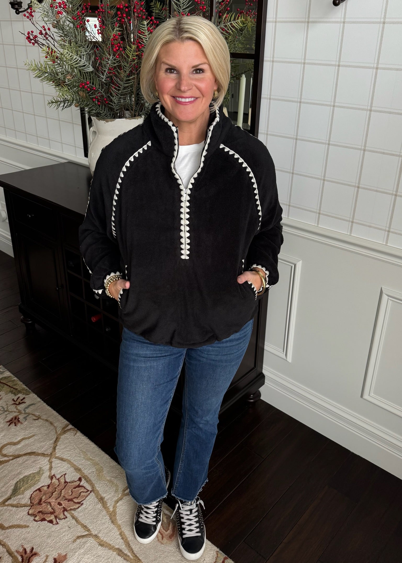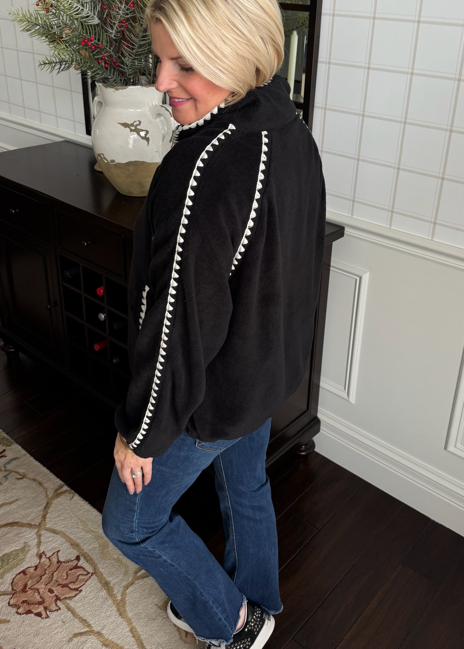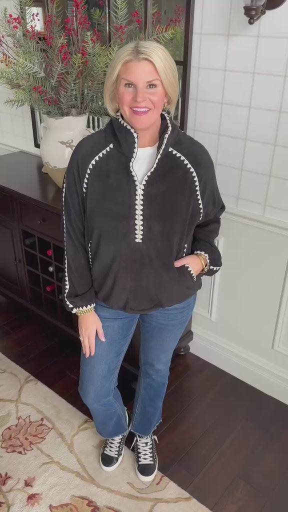 This is the softest fleece pullover! Love the white whipstitch design on the trip. Features a cinchable waist.