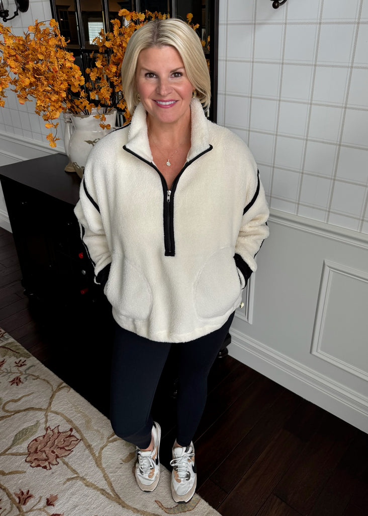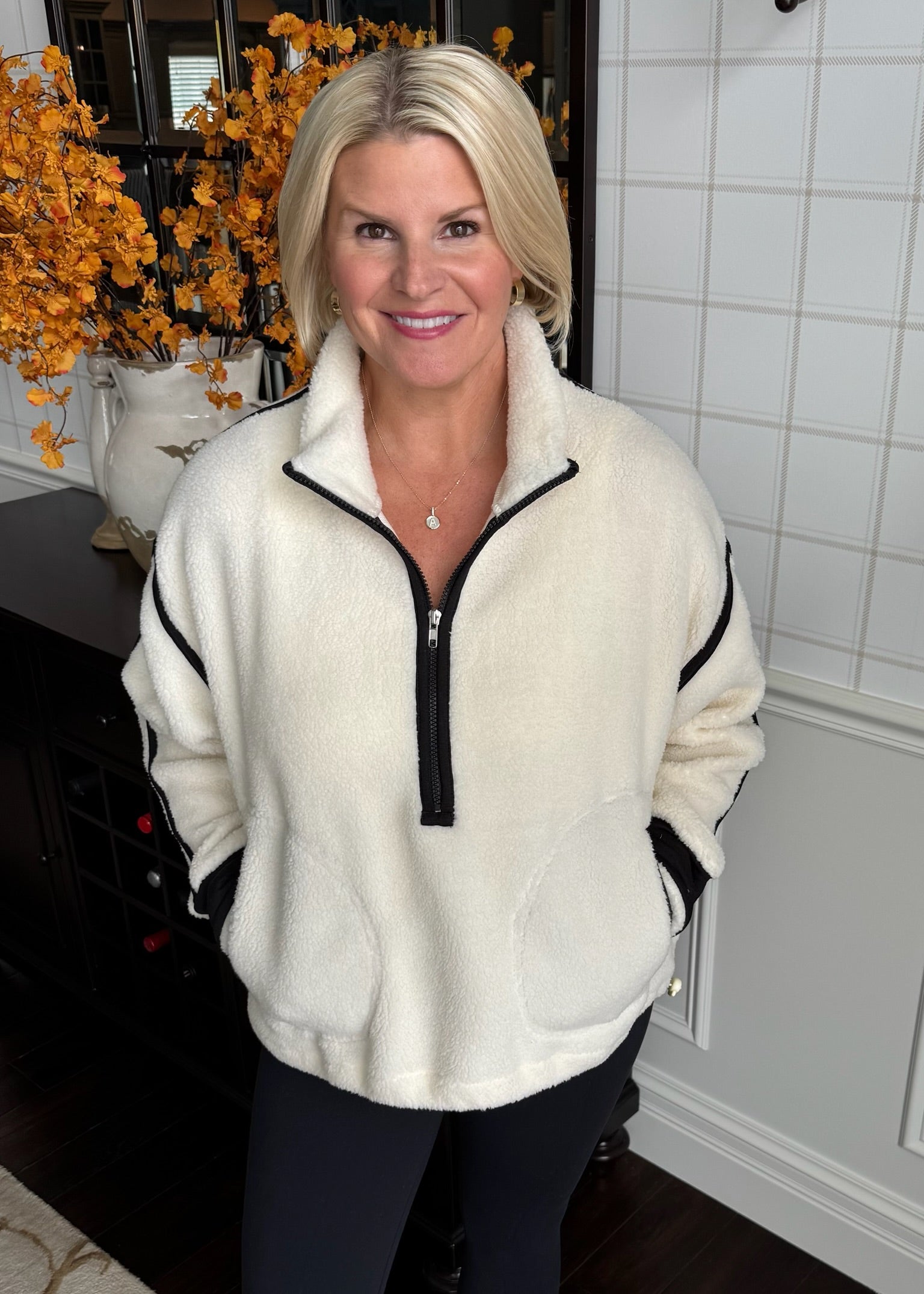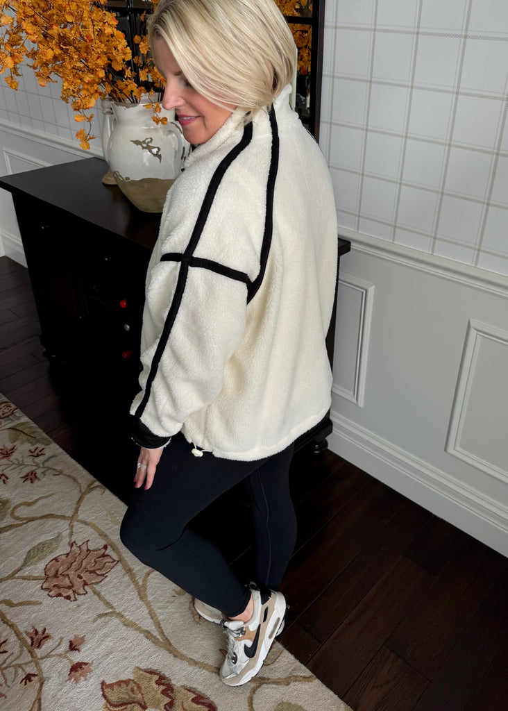 Stay warm and stylish in this half zip jacket. Featuring a fun funnel neck and half zip closure, this fuzzy off-white jacket with bold black piping will keep you warm cozy all season long.