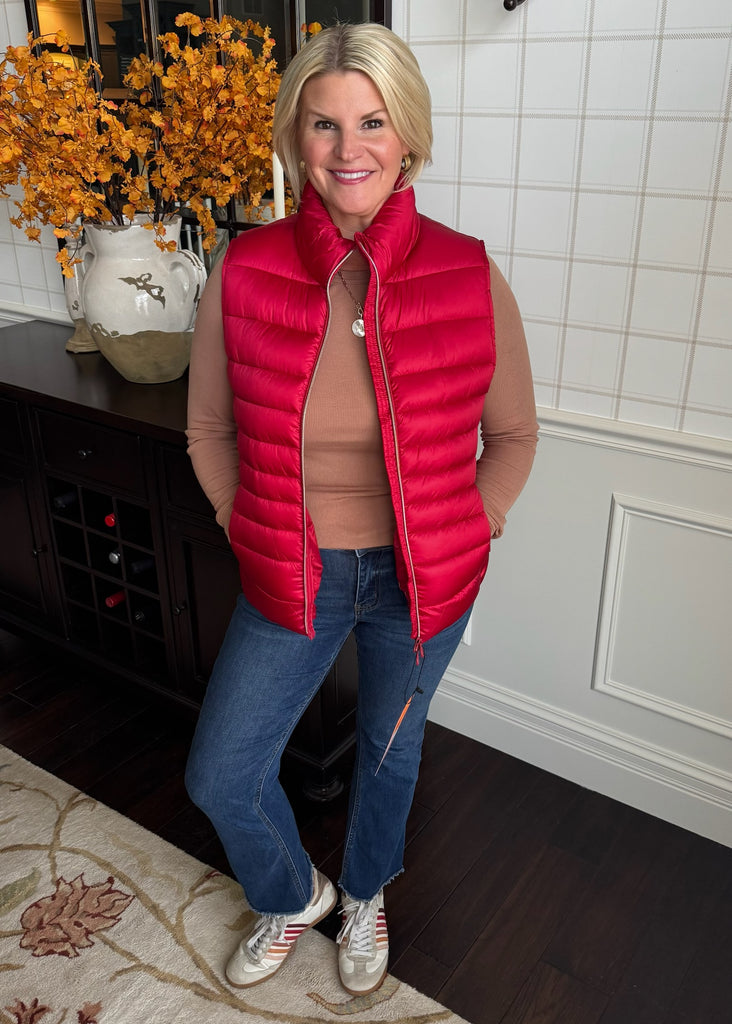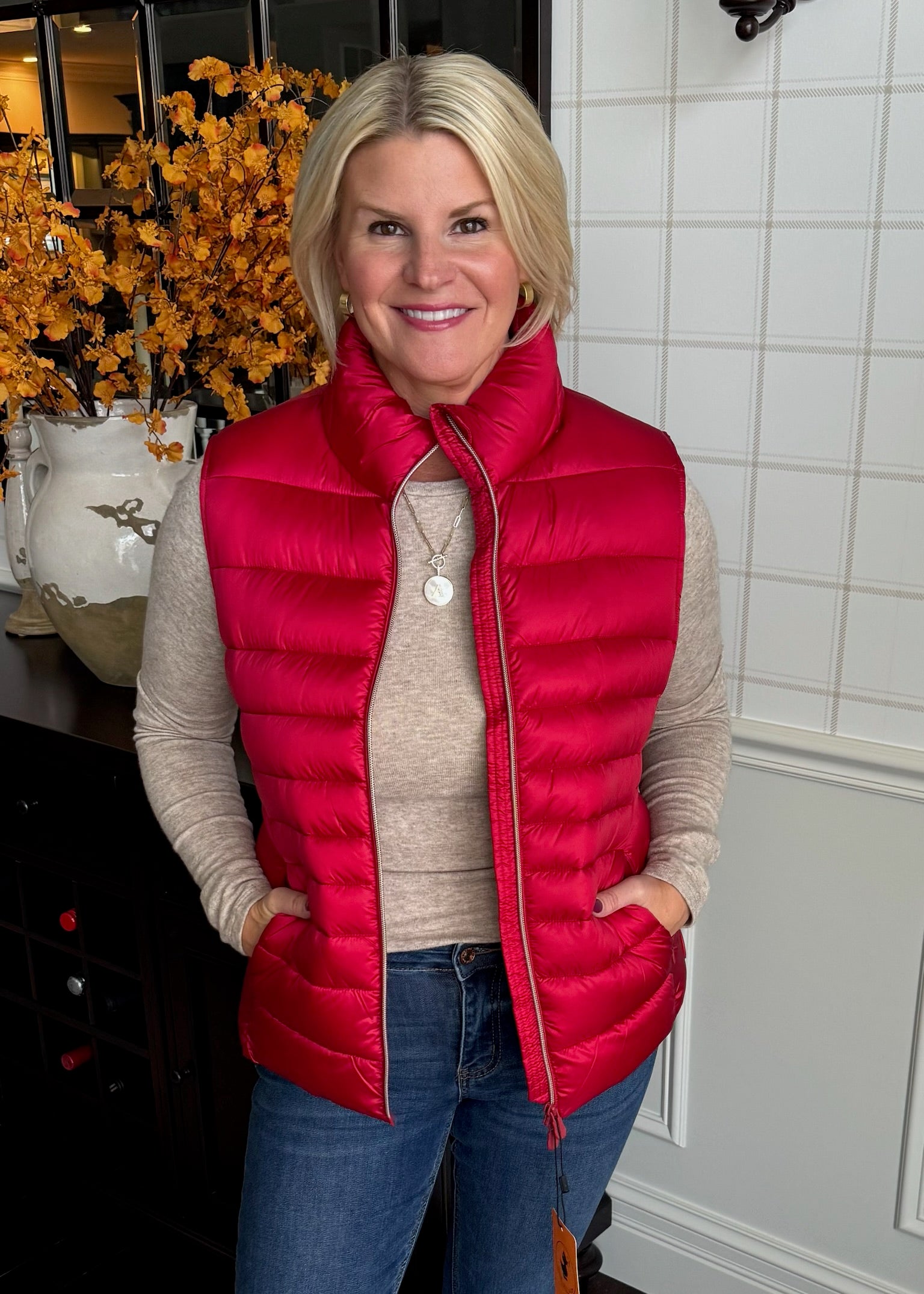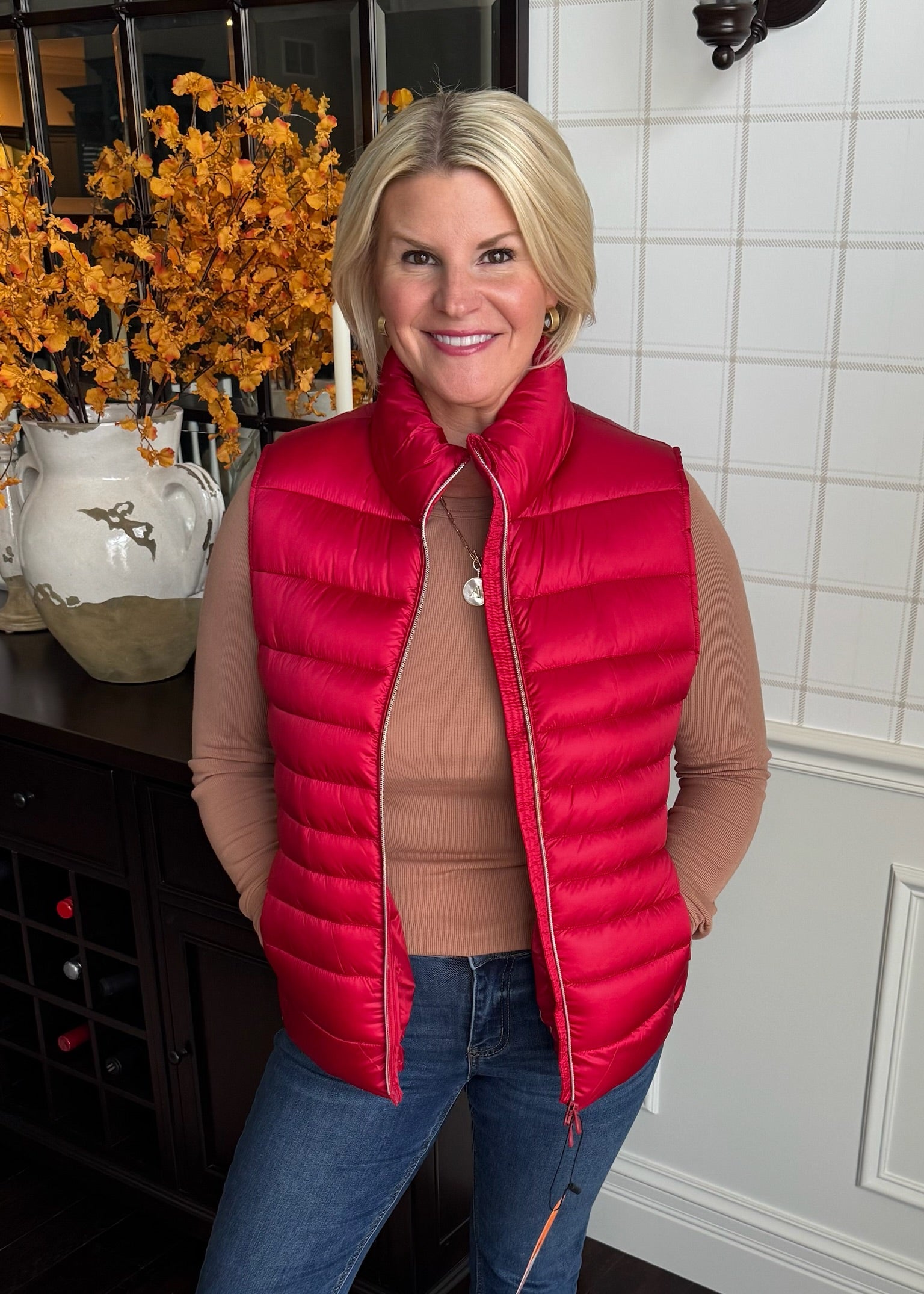 A great layering piece, Lynn is a quilted vest that combines style and comfort with its cozy standing collar. This slim-fit design features a shiny two-way zipper and low side pockets with hidden zippers for a sleek look. Personalized pullers and a small tonal rubber logo at the bottom add a discreet yet playful signature touch.