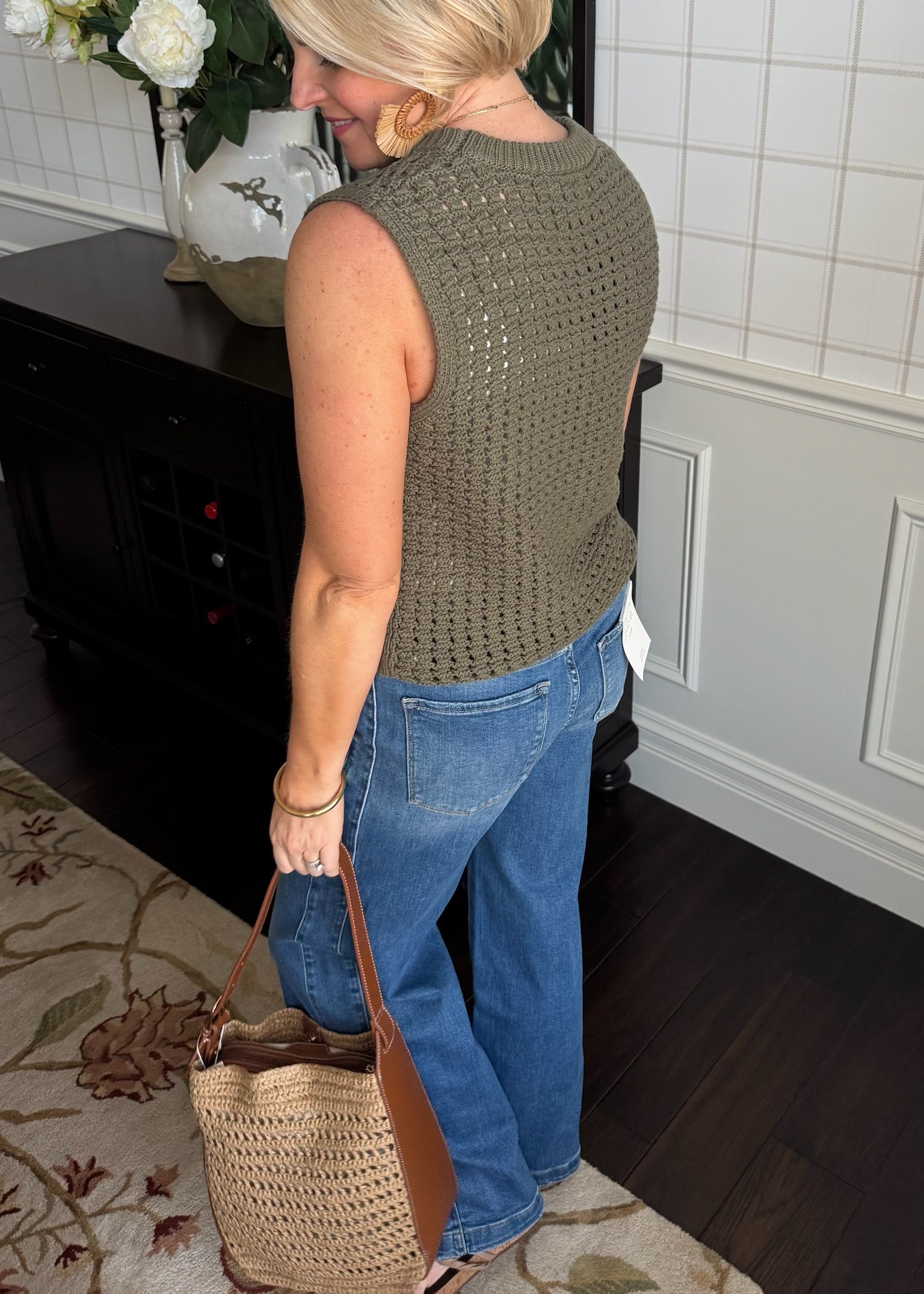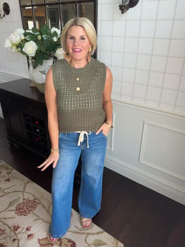 This adorable open knit sleeveless olive sweater is such a cute piece!